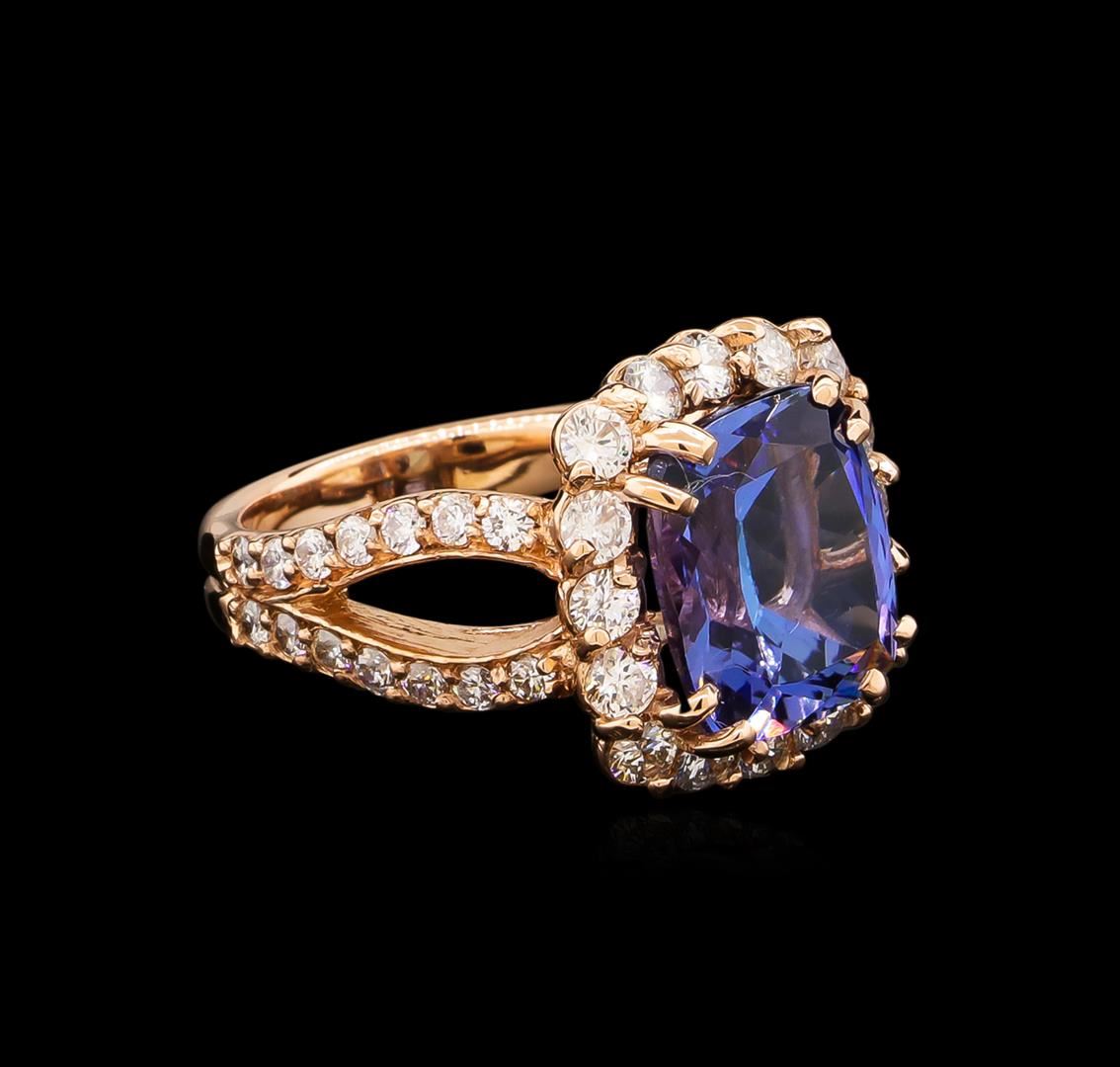 One electronically tested 14KT rose gold lady's cast fashion ring with a split shank halo with a bright polish finish. The featured lady's ring has a double shank measuring 3.77 millimeters wide. Identified with markings of "14K". Condition is new, good workmanship. Containing: One prong set rectangular cushion modified brilliant cut natural tanzanite, measuring 11.68 x 10.06 x 6.51mm, approximate weight of 6.12ct., clarity is eye clean, type I, medium dark, slightly grayish, bluish violet color, (GIA bV 6/2), cut is very good. Transmitting light with no distortion, transparent. Colored gemstones are presumed to have been subjected to commonly used enhancement processes. Graded in the setting. Sixteen prong set round brilliant cut diamonds, measuring 2.60 - 2.50 x 1.58mm (depth est.) approximate total weight of 16 Stones = 1.00ct. Graded in the setting. Clarity: SI-1 to I-1. Color: H - I. Cut Good Twenty-Eight prong set round brilliant cut diamonds, measuring 1.90 - 1.80 x 1.15mm (depth est.) approximate total weight of 28 Stones = 0.68ct. Graded in the setting. Clarity: SI-1 to I-1. Color: H - I. Cut Good. Total Weight of Colored Stones 6.12ct. Total Weight of Diamonds 1.68ct. Total Weight of Ring 9.60gm. GAS Appraised at $13,120.00.