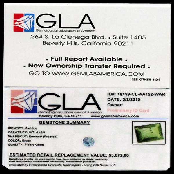 Excellent clear neon green specimen emerald cut with sought after inclusions; lab quality evaluation 7; typical treatment likely; Gem Guide wholesale $398-$918; full retail appraisal $3672; full lab evaluation available