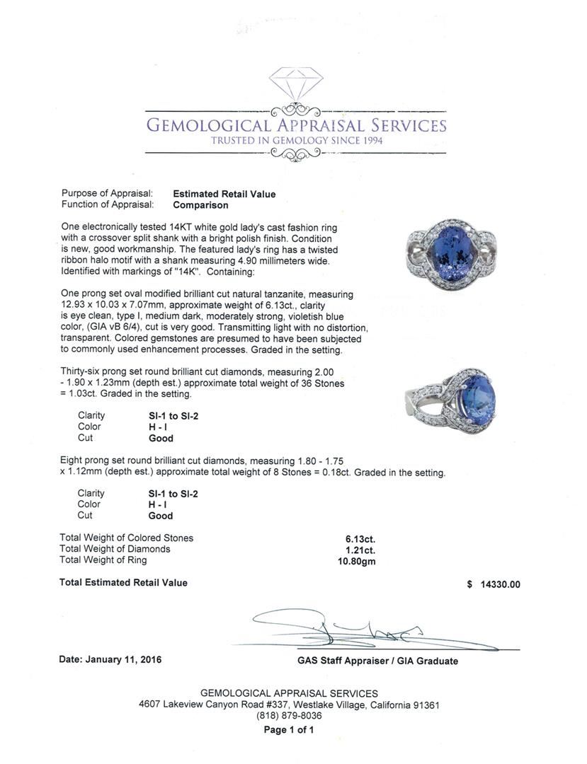 One electronically tested 14KT white gold lady's cast fashion ring with a crossover split shank with a bright polish finish. The featured lady's ring has a twisted ribbon halo motif with a shank measuring 4.90 millimeters wide. Identified with markings of "14K". Condition is new, good workmanship. Containing: One prong set oval modified brilliant cut natural tanzanite, measuring 12.93 x 10.03 x 7.07mm, approximate weight of 6.13ct., clarity is eye clean, type I, medium dark, moderately strong, violetish blue color, (GIA vB 6/4), cut is very good. Transmitting light with no distortion, transparent. Colored gemstones are presumed to have been subjected to commonly used enhancement processes. Graded in the setting. Thirty-Six prong set round brilliant cut diamonds, measuring 2.00 - 1.90 x 1.23mm (depth est.) approximate total weight of 36 Stones = 1.03ct. Graded in the setting. Clarity: SI-1 to SI-2. Color: H - I. Cut Good Eight prong set round brilliant cut diamonds, measuring 1.80 - 1.75 x 1.12mm (depth est.) approximate total weight of 8 Stones = 0.18ct. Graded in the setting. Clarity: SI-1 to SI-2. Color: H - I. Cut Good. Total Weight of Colored Stones 6.13ct. Total Weight of Diamonds 1.21ct. Total Weight of Ring 10.80gm. GAS Appraised at $14,330.00.