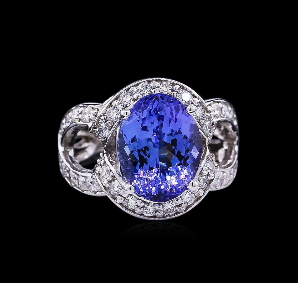 One electronically tested 14KT white gold lady's cast fashion ring with a crossover split shank with a bright polish finish. The featured lady's ring has a twisted ribbon halo motif with a shank measuring 4.90 millimeters wide. Identified with markings of "14K". Condition is new, good workmanship. Containing: One prong set oval modified brilliant cut natural tanzanite, measuring 12.93 x 10.03 x 7.07mm, approximate weight of 6.13ct., clarity is eye clean, type I, medium dark, moderately strong, violetish blue color, (GIA vB 6/4), cut is very good. Transmitting light with no distortion, transparent. Colored gemstones are presumed to have been subjected to commonly used enhancement processes. Graded in the setting. Thirty-Six prong set round brilliant cut diamonds, measuring 2.00 - 1.90 x 1.23mm (depth est.) approximate total weight of 36 Stones = 1.03ct. Graded in the setting. Clarity: SI-1 to SI-2. Color: H - I. Cut Good Eight prong set round brilliant cut diamonds, measuring 1.80 - 1.75 x 1.12mm (depth est.) approximate total weight of 8 Stones = 0.18ct. Graded in the setting. Clarity: SI-1 to SI-2. Color: H - I. Cut Good. Total Weight of Colored Stones 6.13ct. Total Weight of Diamonds 1.21ct. Total Weight of Ring 10.80gm. GAS Appraised at $14,330.00.