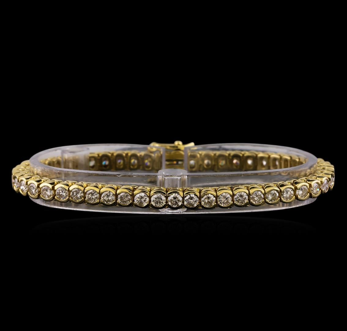 One electronically tested 14KT yellow gold ladies cast & assembled diamond tennis bracelet with a bright polish finish. Seven and one-quarter inch length bracelet composed of a flexible ribbon of diamonds, terminating in a concealed clasp with safety. Identified with markings of '14K'. Condition is good. Tennis bracelets & necklaces got their unusual name from an incident involving the U.S. professional tennis player Chris Evert during a tennis match in the 1980's. Evert had been wearing an expensive diamond bracelet, an inline string of individually set diamonds. Previously these bracelets were known as eternity bracelets. When the clasp snapped during play, she asked the officials to stop the tennis match until the bracelet could be found. Since that day, bracelets and necklaces featuring an inline string of diamonds have been called tennis bracelets and tennis necklaces. Containing: Fifty-One half bezel set round brilliant cut diamonds, measuring 3.30 - 3.20 x 1.95mm (depth est.) approximate total weight of 51 Stones = 6.14ct. The color grade reflects the entire range of color for this group. Graded in the setting. Clarity SI-2 to I-2. Color: G - J. Total Weight of Diamonds 6.14ct.. Total Weight of Bracelet 22.95gm. AIG Appraised at $16,995.00.