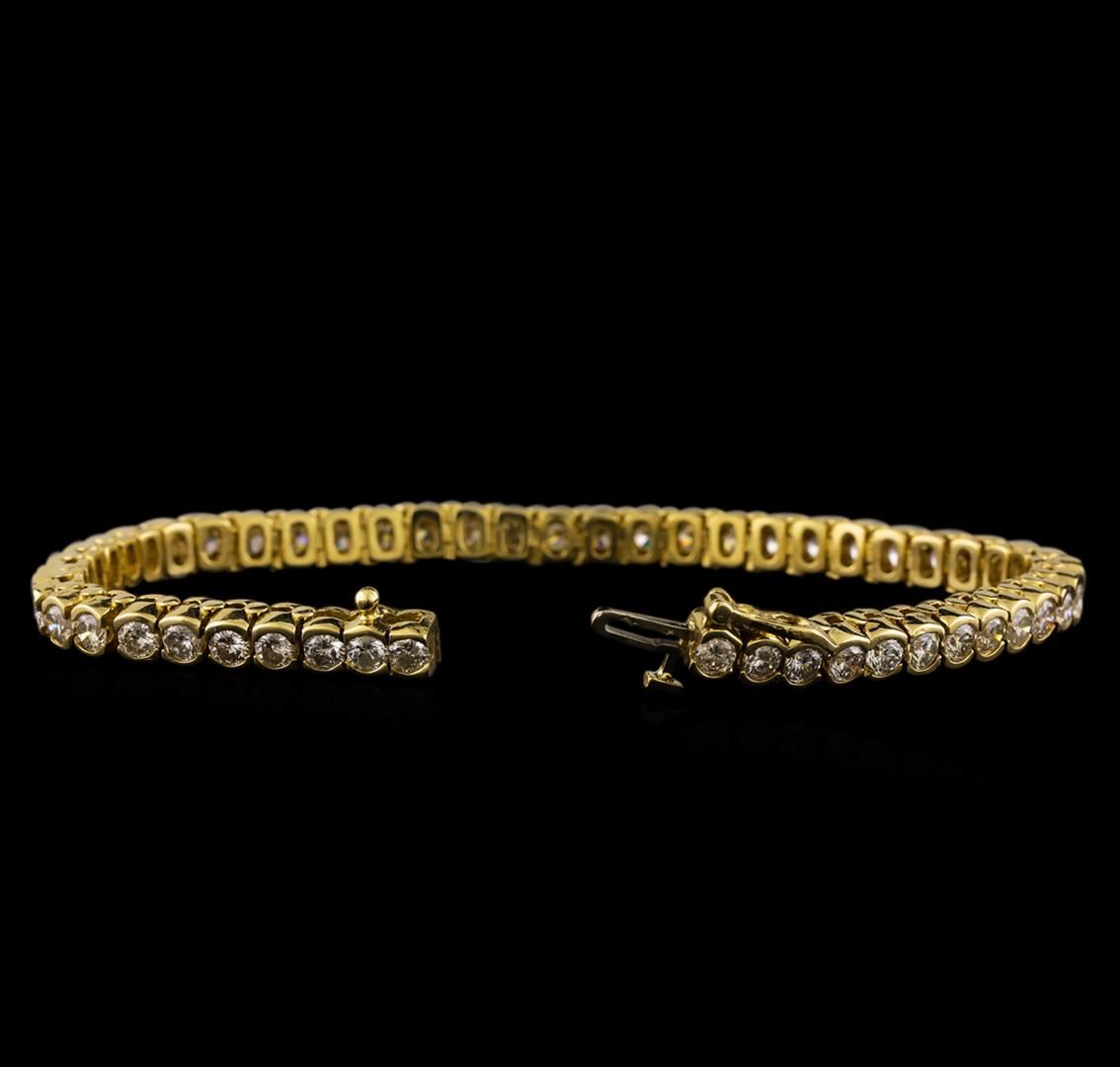 One electronically tested 14KT yellow gold ladies cast & assembled diamond tennis bracelet with a bright polish finish. Seven and one-quarter inch length bracelet composed of a flexible ribbon of diamonds, terminating in a concealed clasp with safety. Identified with markings of '14K'. Condition is good. Tennis bracelets & necklaces got their unusual name from an incident involving the U.S. professional tennis player Chris Evert during a tennis match in the 1980's. Evert had been wearing an expensive diamond bracelet, an inline string of individually set diamonds. Previously these bracelets were known as eternity bracelets. When the clasp snapped during play, she asked the officials to stop the tennis match until the bracelet could be found. Since that day, bracelets and necklaces featuring an inline string of diamonds have been called tennis bracelets and tennis necklaces. Containing: Fifty-One half bezel set round brilliant cut diamonds, measuring 3.30 - 3.20 x 1.95mm (depth est.) approximate total weight of 51 Stones = 6.14ct. The color grade reflects the entire range of color for this group. Graded in the setting. Clarity SI-2 to I-2. Color: G - J. Total Weight of Diamonds 6.14ct.. Total Weight of Bracelet 22.95gm. AIG Appraised at $16,995.00.