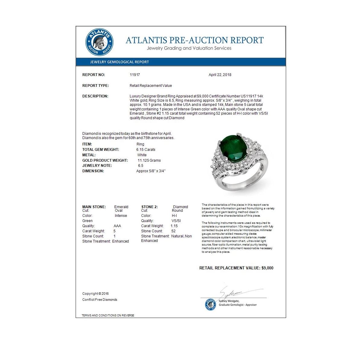 REF-126Y2K -11917 ---- 6.15 CTW Emerald & Diamond Ring 14K White Gold ---- Luxury Designer Brand Ring Appraised at $9,000 Certificate Number US11917 14k White gold, Ring Size is 6.5, Ring measuring approx. 5/8" x 3/4" , weighing in total approx. 10.1 grams. Made in the USA and is stamped 14k, Main stone 5 carat total weight containing 1 pieces of Intense Green color with AAA quality Oval shape cut Emerald , Stone #2 1.15 carat total weight containing 52 pieces of H-I color with VS/SI quality Round shape cut Diamond