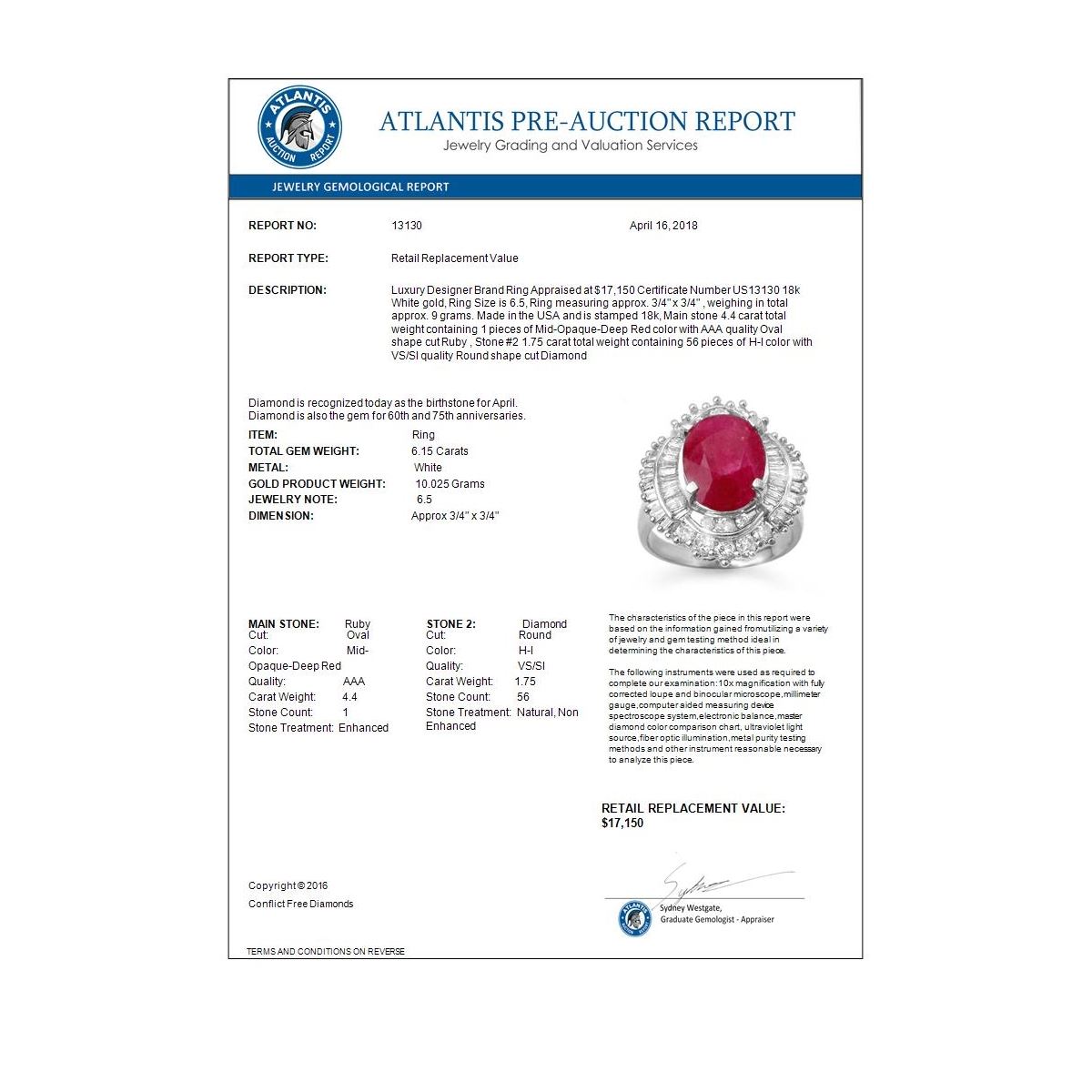 REF-222M8H -13130 ---- 6.15 CTW Ruby & Diamond Ring 18K White Gold ---- Luxury Designer Brand Ring Appraised at $17,150 Certificate Number US13130 18k White gold, Ring Size is 6.5, Ring measuring approx. 3/4" x 3/4" , weighing in total approx. 9 grams. Made in the USA and is stamped 18k, Main stone 4.4 carat total weight containing 1 pieces of Mid-Opaque-Deep Red color with AAA quality Oval shape cut Ruby , Stone #2 1.75 carat total weight containing 56 pieces of H-I color with VS/SI quality Round shape cut Diamond