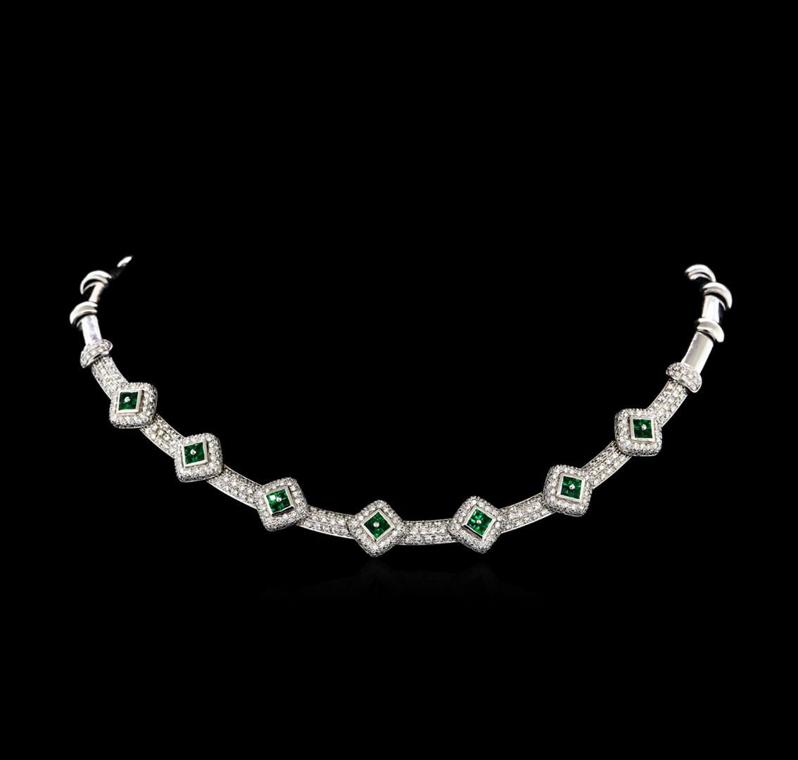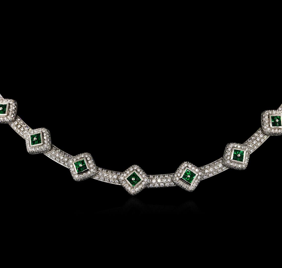 One electronically tested 18KT white gold lady's combination cast & assembled fashion necklace with a tongue clasp with foldover safety with a bright polish finish. The featured lady's necklace measures sixteen inches in length. Identified with markings of "18K 750". Condition is new, good workmanship. Containing: Twenty-eight channel set square modified step cut natural emeralds, measuring 2.20 x 2.15 x 1.42mm, approximate total weight of 1.40ct., clarity is eye clean, type III, medium, strong, green color, (GIA G 5/5), cut is very good. Transmitting light with no distortion, transparent. Indications of oil residue. Graded in the setting. One Hundred Fifty prong set round brilliant cut diamonds, measuring 1.70 - 1.60 x 1.02mm (depth est.) approximate total weight of 150 Stones = 2.50ct. Graded in the setting. Clarity: VS-2 to SI-1. Color: G - I. Cut Very Good Three Hundred Ninety-Two prong set round brilliant cut diamonds, measuring 1.40 - 1.30 x 0.84mm (depth est.) approximate total weight of 392 Stones = 3.65ct. Graded in the setting. Clarity: VS-2 to SI-1. Color: G - I. Cut Very Good. Total Weight of Colored Stones 1.40ct. Total Weight of Diamonds 6.15ct. Total Weight of Necklace 81.50gm. GAS Appraised at $37,705.00.