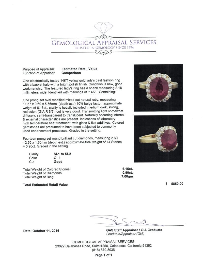 One electronically tested 14KT yellow gold lady's cast fashion ring with a basket halo with a bright polish finish. The featured lady's ring has a shank measuring 2.18 millimeters wide. Identified with markings of '14K'. Condition is new, good workmanship. Containing: One prong set oval modified mixed cut natural ruby, measuring 11.57 x 9.69 x 5.86mm, (depth est.) 10%. bulge factor, approximate weight of 6.15ct., clarity is heavily included, medium dark, strong, red color, (GIA R 6/5), cut is very good. Transmitting light somewhat diffusely, semi-transparent to translucent. Naturally occurring internal & external characteristics are present. Indications of laboratory high temperature heat treatment, with glass & flux additives. Colored gemstones are presumed to have been subjected to commonly used enhancement processes. Graded in the setting. Fourteen prong set round brilliant cut diamonds, measuring 2.60 - 2.55 x 1.60mm (depth est.) approximate total weight of 14 Stones = 0.90ct. Graded in the setting. Clarity SI-1 to SI-2. Color: G - I Cut Good. Total Weight of Colored Stones 6.15ct.. Total Weight of Diamonds 0.90ct.. Total Weight of Ring 7.00gm. GAS Appraised at $5,850.00.