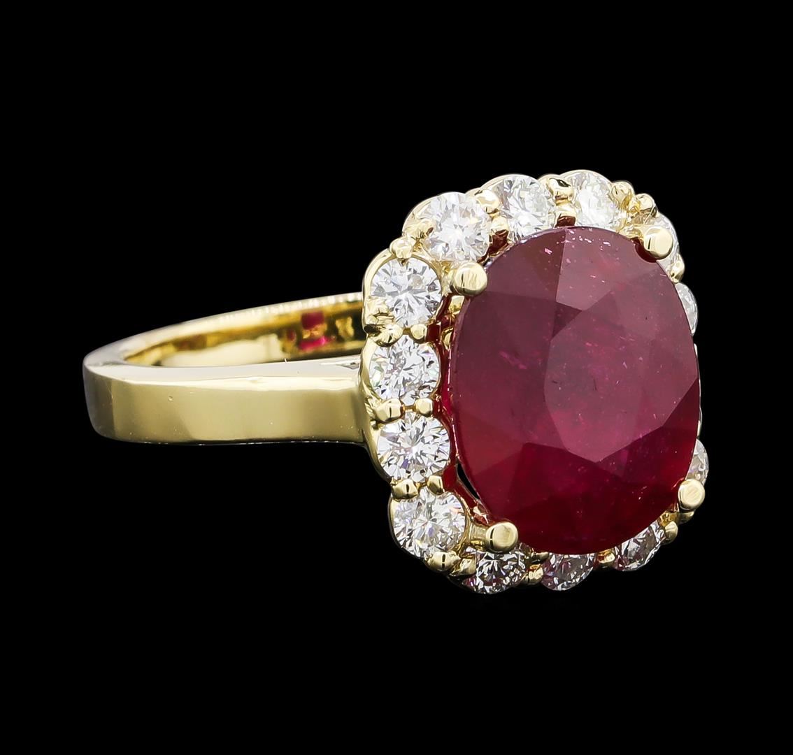 One electronically tested 14KT yellow gold lady's cast fashion ring with a basket halo with a bright polish finish. The featured lady's ring has a shank measuring 2.18 millimeters wide. Identified with markings of '14K'. Condition is new, good workmanship. Containing: One prong set oval modified mixed cut natural ruby, measuring 11.57 x 9.69 x 5.86mm, (depth est.) 10%. bulge factor, approximate weight of 6.15ct., clarity is heavily included, medium dark, strong, red color, (GIA R 6/5), cut is very good. Transmitting light somewhat diffusely, semi-transparent to translucent. Naturally occurring internal & external characteristics are present. Indications of laboratory high temperature heat treatment, with glass & flux additives. Colored gemstones are presumed to have been subjected to commonly used enhancement processes. Graded in the setting. Fourteen prong set round brilliant cut diamonds, measuring 2.60 - 2.55 x 1.60mm (depth est.) approximate total weight of 14 Stones = 0.90ct. Graded in the setting. Clarity SI-1 to SI-2. Color: G - I Cut Good. Total Weight of Colored Stones 6.15ct.. Total Weight of Diamonds 0.90ct.. Total Weight of Ring 7.00gm. GAS Appraised at $5,850.00.