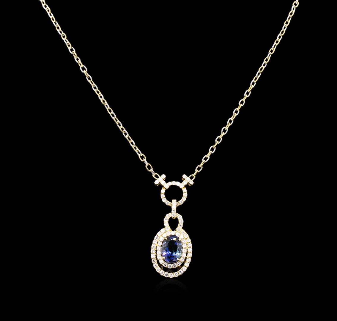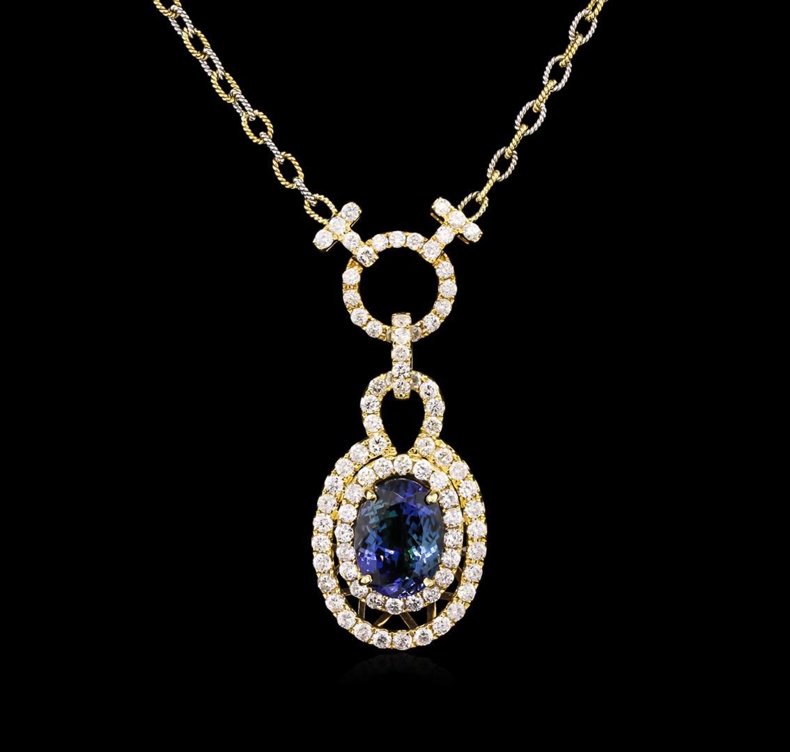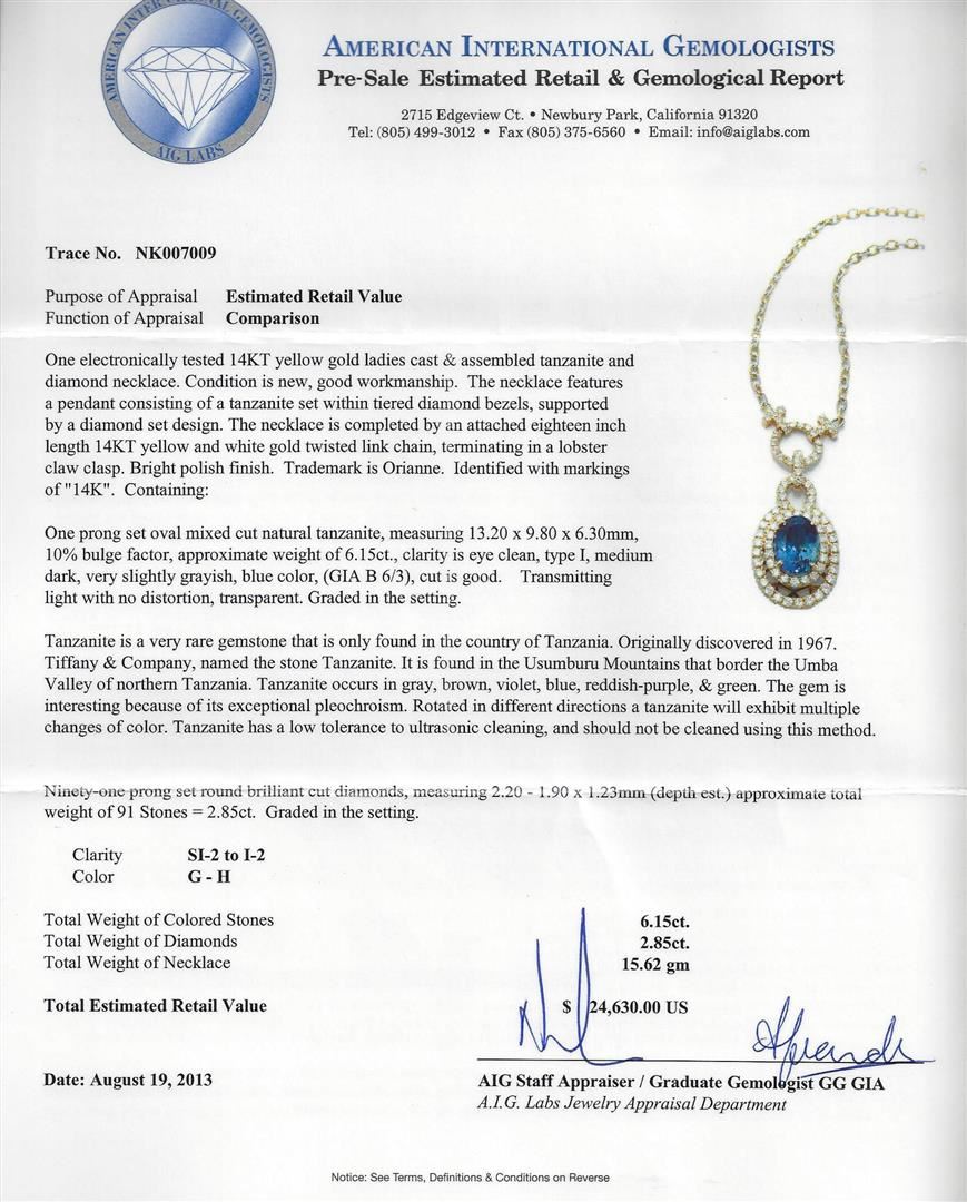 One electronically tested 14KT yellow gold ladies cast & assembled tanzanite and diamond necklace. Condition is new, good workmanship. The necklace features a pendant consisting of a tanzanite set within tiered diamond bezels, supported by a diamond set design. The necklace is completed by an attached eighteen inch length 14KT yellow and white gold twisted link chain, terminating in a lobster claw clasp. Bright polish finish. Trademark is Orianne. Identified with markings of "14K". Containing: One prong set oval mixed cut natural tanzanite, measuring 13.20 x 9.80 x 6.30mm, 10% bulge factor, approximate weight of 6.15ct., clarity is eye clean, type I, medium dark, very slightly grayish, blue color, (GIA B 6/3), cut is good. Transmitting light with no distortion, transparent. Graded in the setting. Tanzanite is a very rare gemstone that is only found in the country of Tanzania. Originally discovered in 1967. Tiffany & Company, named the stone Tanzanite. It is found in the Usumburu Mountains that border the Umba Valley of northern Tanzania. Tanzanite occurs in gray, brown, violet, blue, reddish-purple, & green. The gem is interesting because of its exceptional pleochroism. Rotated in different directions a tanzanite will exhibit multiple changes of color. Tanzanite has a low tolerance to ultrasonic cleaning, and should not be cleaned using this method. Ninety-one prong set round brilliant cut diamonds, measuring 2.20 - 1.90 x 1.23mm (depth est.) approximate total weight of 91 Stones = 2.85ct. Graded in the setting. Clarity: SI-2 to I-2. Color: G - H. Total Weight of Colored Stones: 6.15. Total Weight of Diamonds: 2.85ct. Total Weight of Pendant With Chain: 15.62gm. AIG Appraised at $24,630.00.