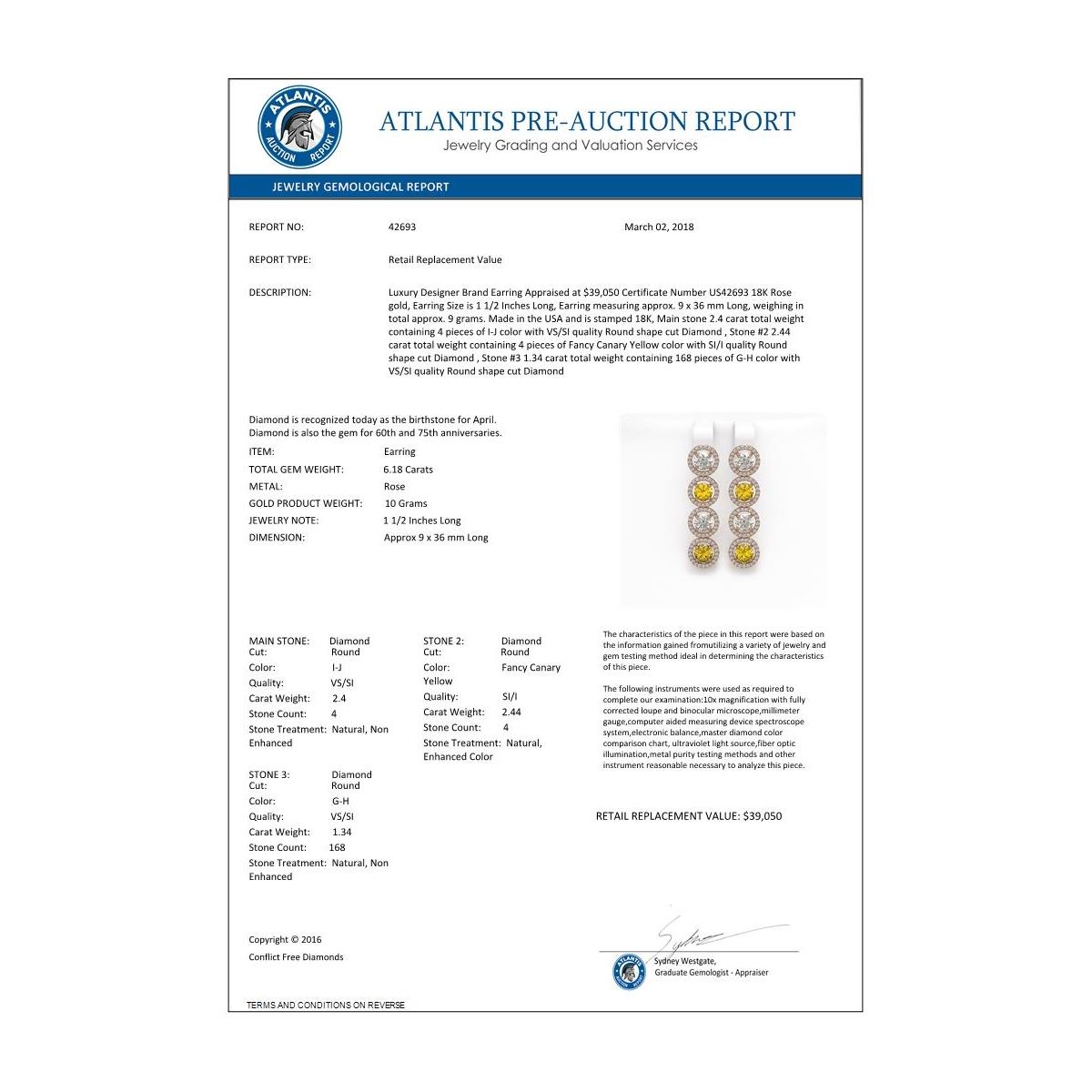 REF-887A6X -42693 ---- 6.18 CTW Canary Yellow & White Diamond Designer Earrings 18K Rose Gold ---- Luxury Designer Brand Earring Appraised at $39,050 Certificate Number US42693 18K Rose gold, Earring Size is 1 1/2 Inches Long, Earring measuring approx. 9 x 36 mm Long, weighing in total approx. 9 grams. Made in the USA and is stamped 18K, Main stone 2.4 carat total weight containing 4 pieces of I-J color with VS/SI quality Round shape cut Diamond , Stone #2 2.44 carat total weight containing 4 pieces of Fancy Canary Yellow color with SI/I quality Round shape cut Diamond , Stone #3 1.34 carat total weight containing 168 pieces of G-H color with VS/SI quality Round shape cut Diamond
