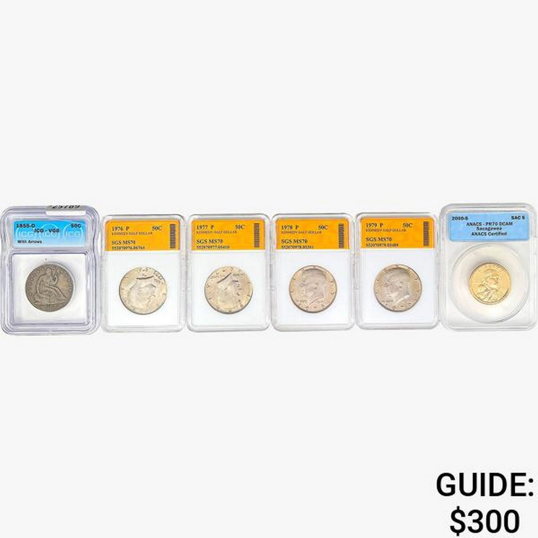 COINS AND CURRENCY LISTED IN GSA’S CATALOG AS GRADED AND ENCAPSULATED BY PCGS, NGC, ANACS, ICG, PCGS CURRENCY, PMG, PCGS BANKNOTE GRADING, CMC OR ANY OTHER THIRD-PARTY GRADING SERVICE ARE LIKEWISE SOLD “AS-IS” EXCEPT AS EXPRESSLY SET FORTH HEREIN. ALL THIRD-PARTY GRADING SERVICE GUARANTEES, INCLUDING AUTHENTICITY, ARE THE SOLE RESPONSIBILITY OF THE THIRD-PARTY GRADING SERVICE AND NOT WARRANTIES OR GUARANTEES OF GSA. BIDDERS SHOULD CONTACT THESE THIRD-PARTY GRADING SERVICES DIRECTLY WITH RESPECT TO ANY CLAIMS OR QUESTIONS THEY MAY HAVE CONCERNING THEIR GUARANTEES AND WARRANTIES. BIDDERS ACKNOWLEDGE AND AGREE THAT AUCTIONEER IS NOT BOUND BY OR LIABLE FOR ANY OPINION OR CERTIFICATION BY ANY THIRD-PARTY GRADING SERVICE. REMOVAL OF A PRODUCT FROM ITS PROTECTIVE CASING OR HOLDER OR ALTERATION OF ANY COIN HOLDER WAIVES ALL RIGHTS CONCERNING THE PRODUCT CONTAINED THEREIN.