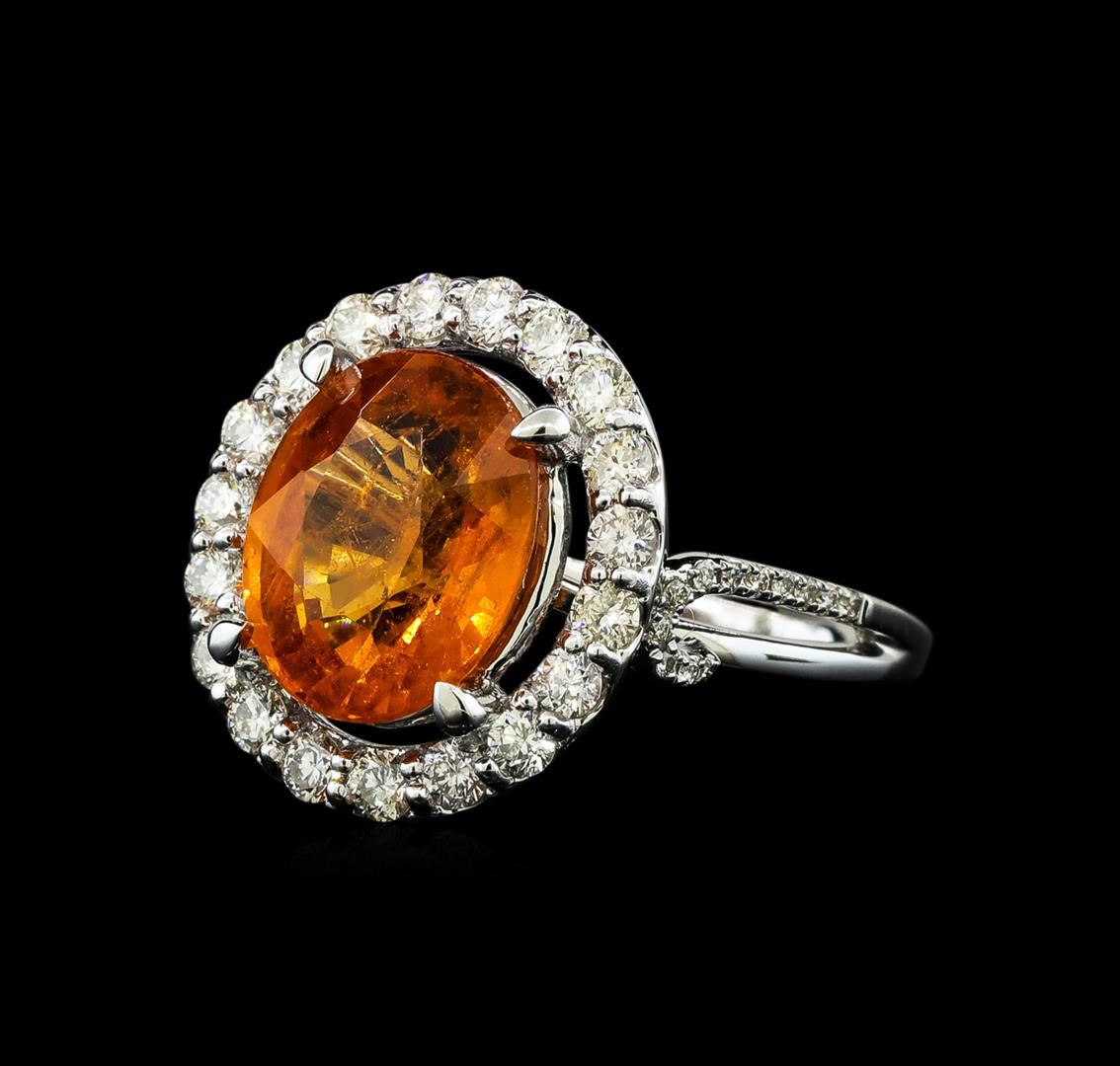 One electronically tested 14KT white gold lady's cast fashion ring with a split shank halo with a bright polish finish. The featured lady's ring has a shank measuring 1.30 millimeters wide. Identified with markings of '14K'. Condition is new, good workmanship. Containing: One prong set oval modified brilliant cut natural mandarin spessartite, measuring 11.75 x 9.53 x 6.00mm, (depth est.) 5%. bulge factor, approximate weight of 6.19ct., clarity is slightly included, medium, moderately strong, orange color, (GIA O 5/4), cut is good. Transmitting light with a minimum of distortion, transparent. Colored gemstones are presumed to have been subjected to commonly used enhancement processes. Graded in the setting. Eighteen prong set round brilliant cut diamonds, measuring 2.30 - 2.20 x 1.40mm (depth est.) approximate total weight of 18 Stones = 0.78ct. Graded in the setting. Clarity SI-1 to SI-2. Color: H - I Cut Good Twenty-Two prong set round brilliant cut diamonds, measuring 1.00 - 0.95 x 0.61mm (depth est.) approximate total weight of 22 Stones = 0.08ct. Graded in the setting. Clarity SI-1 to SI-2. Color: H - I Cut Good. Total Weight of Colored Stones 6.19ct.. Total Weight of Diamonds 0.86ct.. Total Weight of Ring 5.60gm GAS Appraised at $10,960.00.
