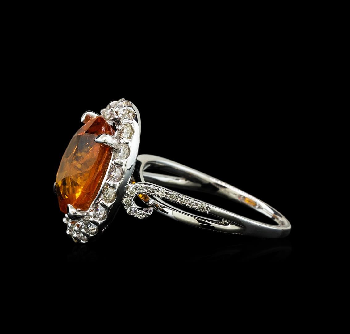 One electronically tested 14KT white gold lady's cast fashion ring with a split shank halo with a bright polish finish. The featured lady's ring has a shank measuring 1.30 millimeters wide. Identified with markings of '14K'. Condition is new, good workmanship. Containing: One prong set oval modified brilliant cut natural mandarin spessartite, measuring 11.75 x 9.53 x 6.00mm, (depth est.) 5%. bulge factor, approximate weight of 6.19ct., clarity is slightly included, medium, moderately strong, orange color, (GIA O 5/4), cut is good. Transmitting light with a minimum of distortion, transparent. Colored gemstones are presumed to have been subjected to commonly used enhancement processes. Graded in the setting. Eighteen prong set round brilliant cut diamonds, measuring 2.30 - 2.20 x 1.40mm (depth est.) approximate total weight of 18 Stones = 0.78ct. Graded in the setting. Clarity SI-1 to SI-2. Color: H - I Cut Good Twenty-Two prong set round brilliant cut diamonds, measuring 1.00 - 0.95 x 0.61mm (depth est.) approximate total weight of 22 Stones = 0.08ct. Graded in the setting. Clarity SI-1 to SI-2. Color: H - I Cut Good. Total Weight of Colored Stones 6.19ct.. Total Weight of Diamonds 0.86ct.. Total Weight of Ring 5.60gm GAS Appraised at $10,960.00.