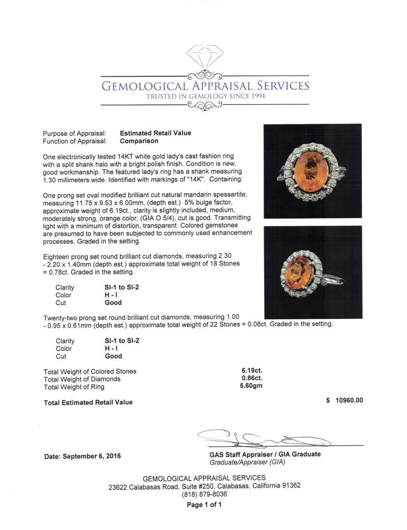 One electronically tested 14KT white gold lady's cast fashion ring with a split shank halo with a bright polish finish. The featured lady's ring has a shank measuring 1.30 millimeters wide. Identified with markings of '14K'. Condition is new, good workmanship. Containing: One prong set oval modified brilliant cut natural mandarin spessartite, measuring 11.75 x 9.53 x 6.00mm, (depth est.) 5%. bulge factor, approximate weight of 6.19ct., clarity is slightly included, medium, moderately strong, orange color, (GIA O 5/4), cut is good. Transmitting light with a minimum of distortion, transparent. Colored gemstones are presumed to have been subjected to commonly used enhancement processes. Graded in the setting. Eighteen prong set round brilliant cut diamonds, measuring 2.30 - 2.20 x 1.40mm (depth est.) approximate total weight of 18 Stones = 0.78ct. Graded in the setting. Clarity SI-1 to SI-2. Color: H - I Cut Good Twenty-Two prong set round brilliant cut diamonds, measuring 1.00 - 0.95 x 0.61mm (depth est.) approximate total weight of 22 Stones = 0.08ct. Graded in the setting. Clarity SI-1 to SI-2. Color: H - I Cut Good. Total Weight of Colored Stones 6.19ct.. Total Weight of Diamonds 0.86ct.. Total Weight of Ring 5.60gm GAS Appraised at $10,960.00.