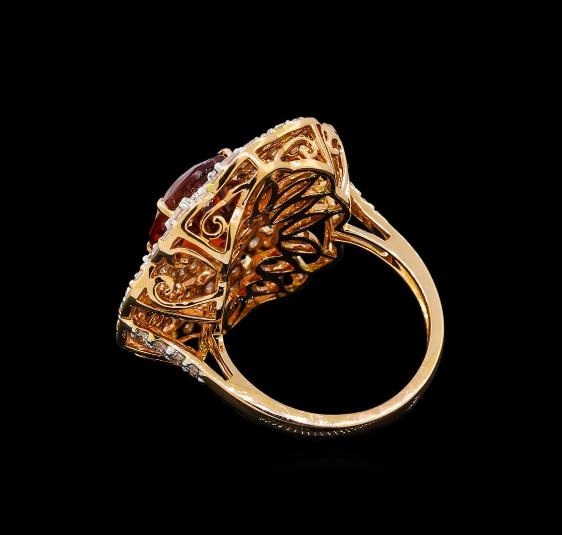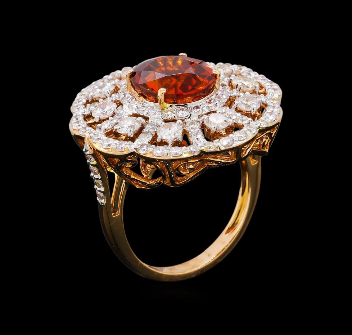 One electronically tested 18KT rose gold lady's cast fashion ring with a double scalloped basket halo with a bright polish finish. The featured lady's ring has a shank measuring 2.58 millimeters in width. Identified with markings of "18K". Condition is new, good workmanship. Containing: One prong set oval modified brilliant cut natural spessartite garnet, measuring 11.00 x 9.18 x 6.44mm, (depth est.) 9%. bulge factor, approximate weight of 6.19ct., clarity is eye clean, medium dark, moderately strong, reddish orange color, (GIA rO 6/4), cut is very good. Transmitting light with no distortion, transparent. Colored gemstones are presumed to have been subjected to commonly used enhancement processes. Graded in the setting. Ten prong set round brilliant cut diamonds, measuring 3.10 - 3.00 x 1.90mm (depth est.) approximate total weight of 10 Stones = 1.08ct. Graded in the setting. Clarity: SI-1 to SI-2. Color: H - I. Cut Good One Hundred prong set round brilliant cut diamonds, measuring 1.70 - 1.60 x 0.99mm (depth est.) approximate total weight of 100 Stones = 1.66ct. Graded in the setting. Clarity: VS-2 to SI-2. Color: G - Good. Total Weight of Colored Stones 6.19ct. Total Weight of Diamonds 2.74ct. Total Weight of Ring 10.60gm. GAS Appraised at $12,675.00.
