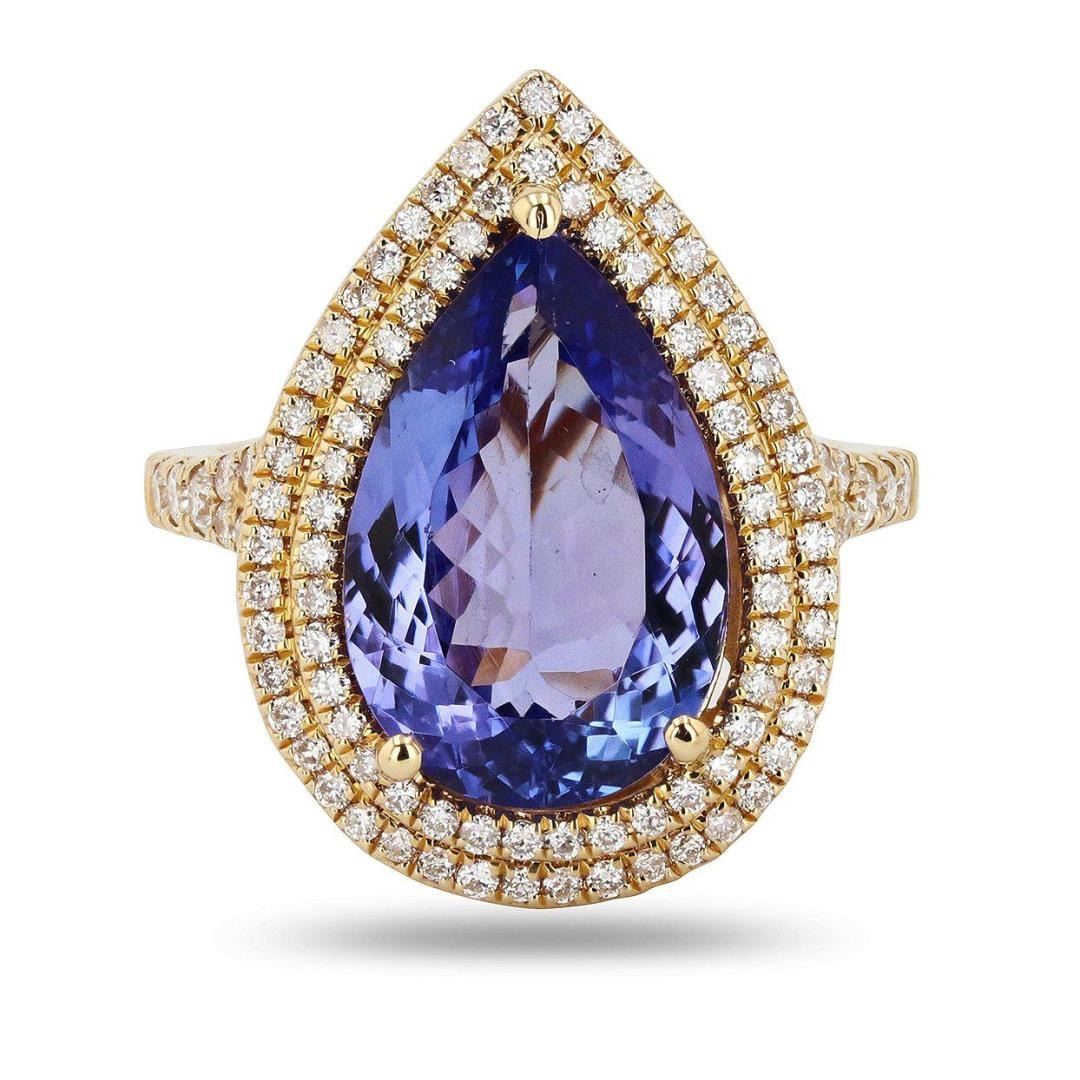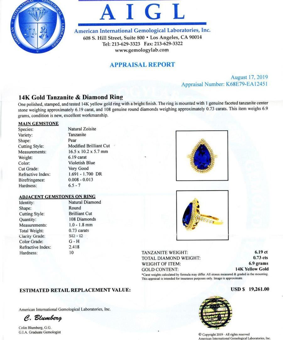One polished, stamped, and tested 14K yellow gold ring with a bright finish. The ring is mounted with 1 genuine faceted tanzanite center stone weighing approximately 6.19 carat, and 108 genuine round diamonds weighing approximately 0.73 carats. This item weighs 6.9 grams, condition is new, excellent workmanship. MAIN GEMSTONE Species: Natural Zoisite Variety: Tanzanite Shape: Pear Cutting Style: Modified Brilliant Cut Measurements: 16.5 x 10.2 x 5.7mm Weight: 6.19 carat Color: Violetish Blue Cut Grade: Very Good Refractive Index: 1.691 - 1.700 DR Birefringence: 0.008 - 0.013 Hardness: 6.5 - 7 ADJACENT GEMSTONES ON RING Identity: Natural Diamond Shape: Round Cutting Style: Brilliant Cut Quantity: 108 Diamonds Measurements: 1.0 - 1.8mm Total Weight: 0.73 carats Clarity Grade: SI2 to I2 Color Grade: G - H Refractive Index: 2.418 Hardness: 10 TANZANITE WEIGHT: 6.19ct TOTAL DIAMOND WEIGHT: 0.73ctw WEIGHT OF ITEM: 6.9 grams GOLD CONTENT: 14K Yellow Gold