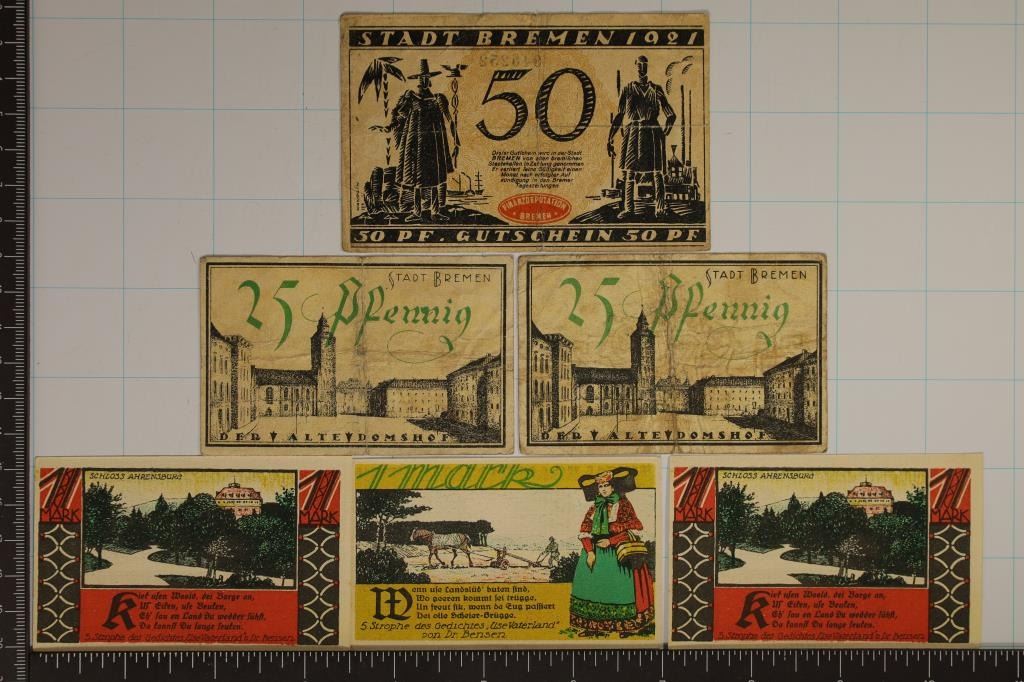 UNC (ALL DIFFERENT DESIGNS ON THE REVERSE) AND 3 BREMEN 2-25 PFENNINNG AND 1-50 PFENNING