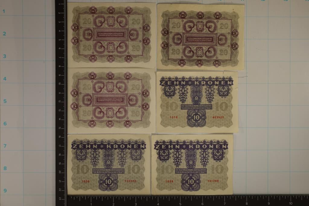 3-20 KRONEN (1 IS CU). SOME EDGE RIPS ON THE TEN KRONENS AND ONE OF THE 20'S HAS SMALL STAIN SPOTS