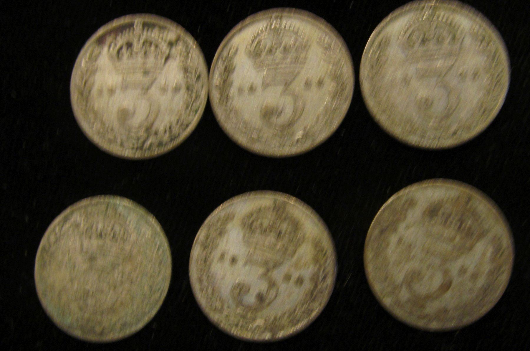 (6) 1926 Silver Great Britain Three Pence Coins.