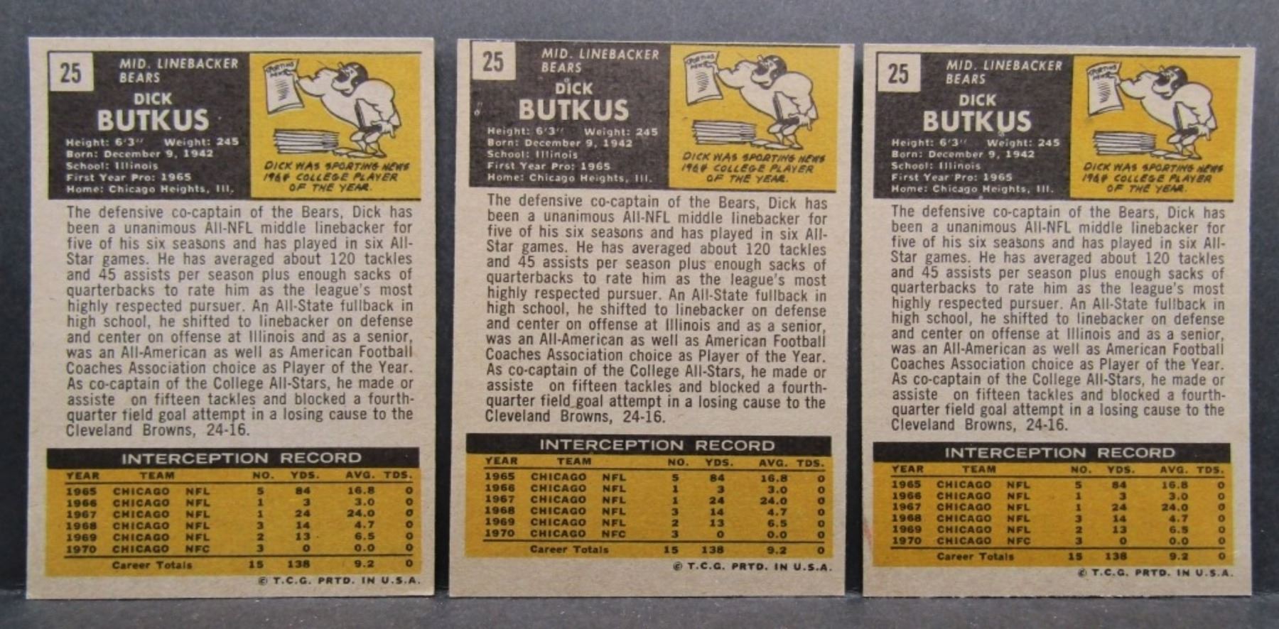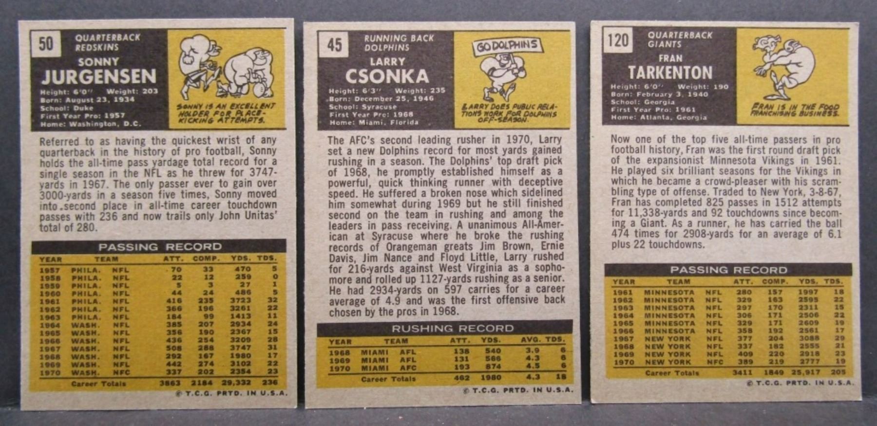 (3) #25 BUTKUS, #45 CSONKA, #50 JURGENSEN, #120 TARKENTON - NICE CLEAN LOT