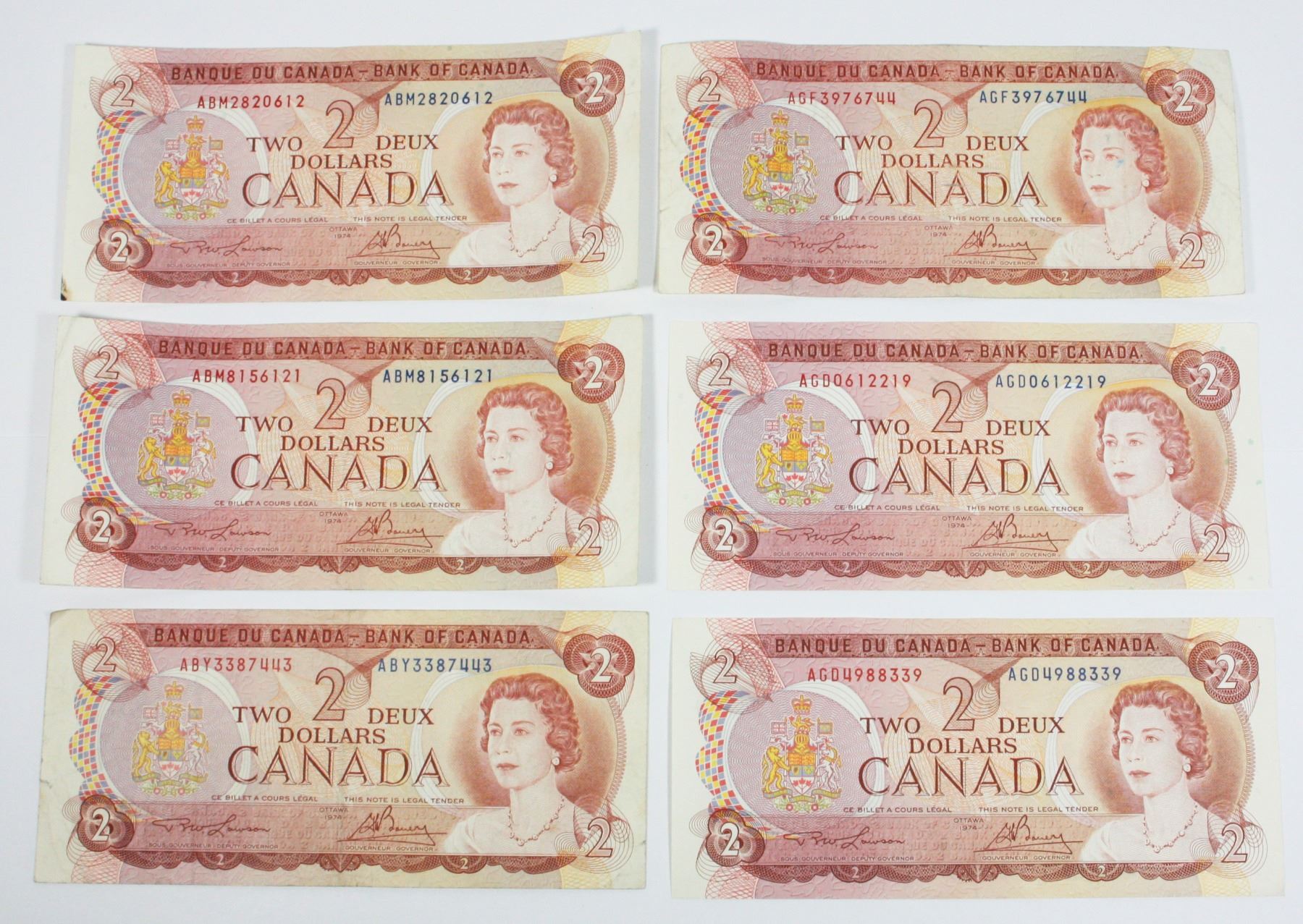 LOOK CLOSELY PART OF GOV'T RECALL 2020 NO LONGER CIRCULATING. 6 of the final $2 bills of 1974 all with different grades and signatures in great condition' great for making bills groups out of these two last