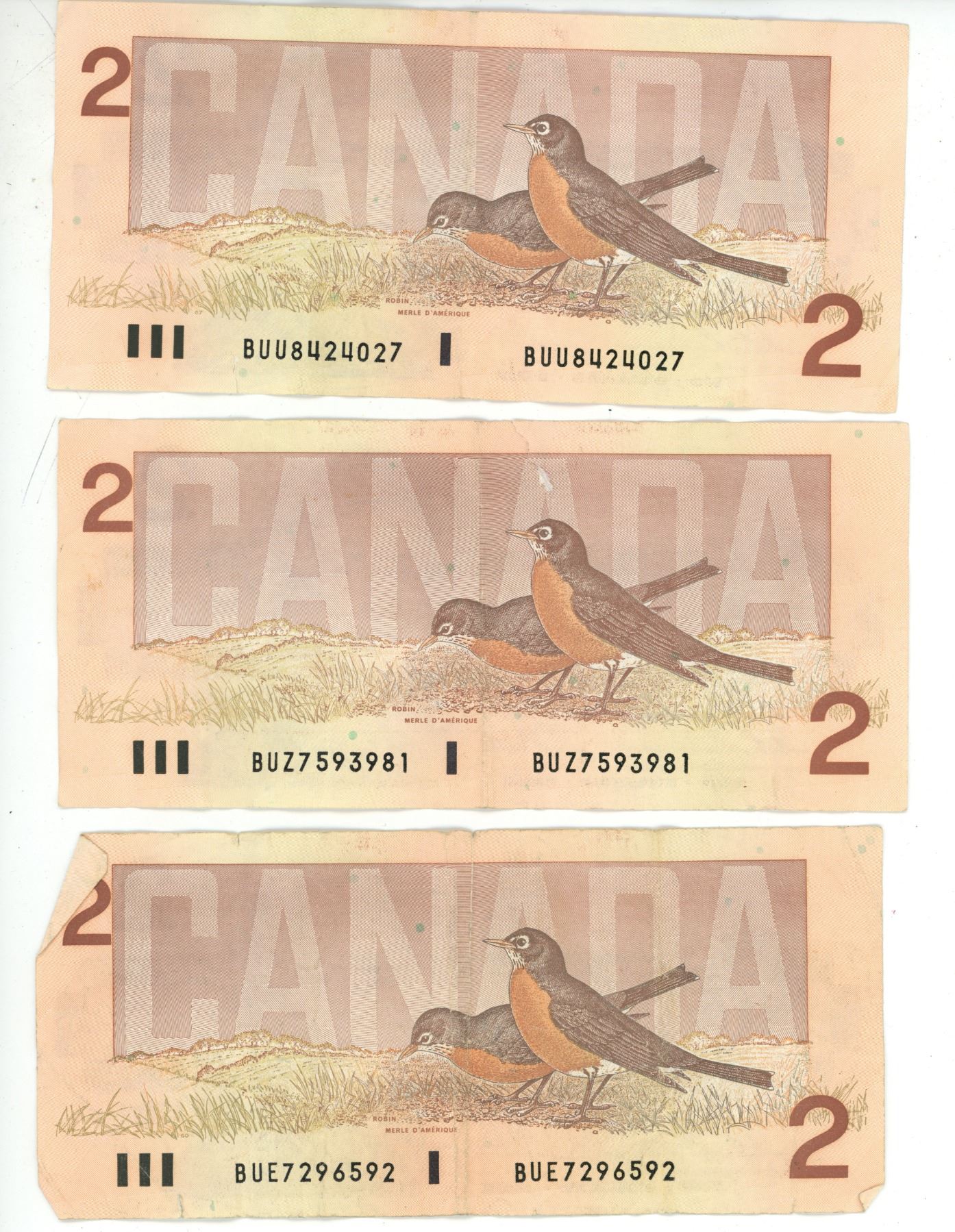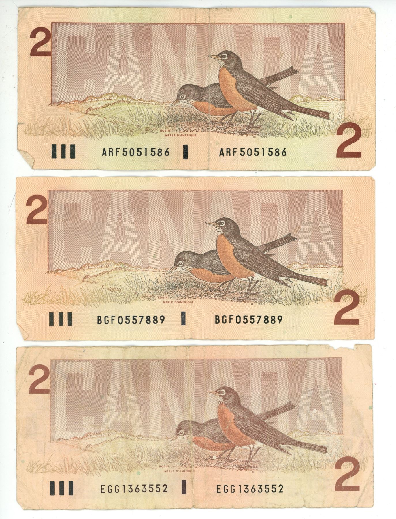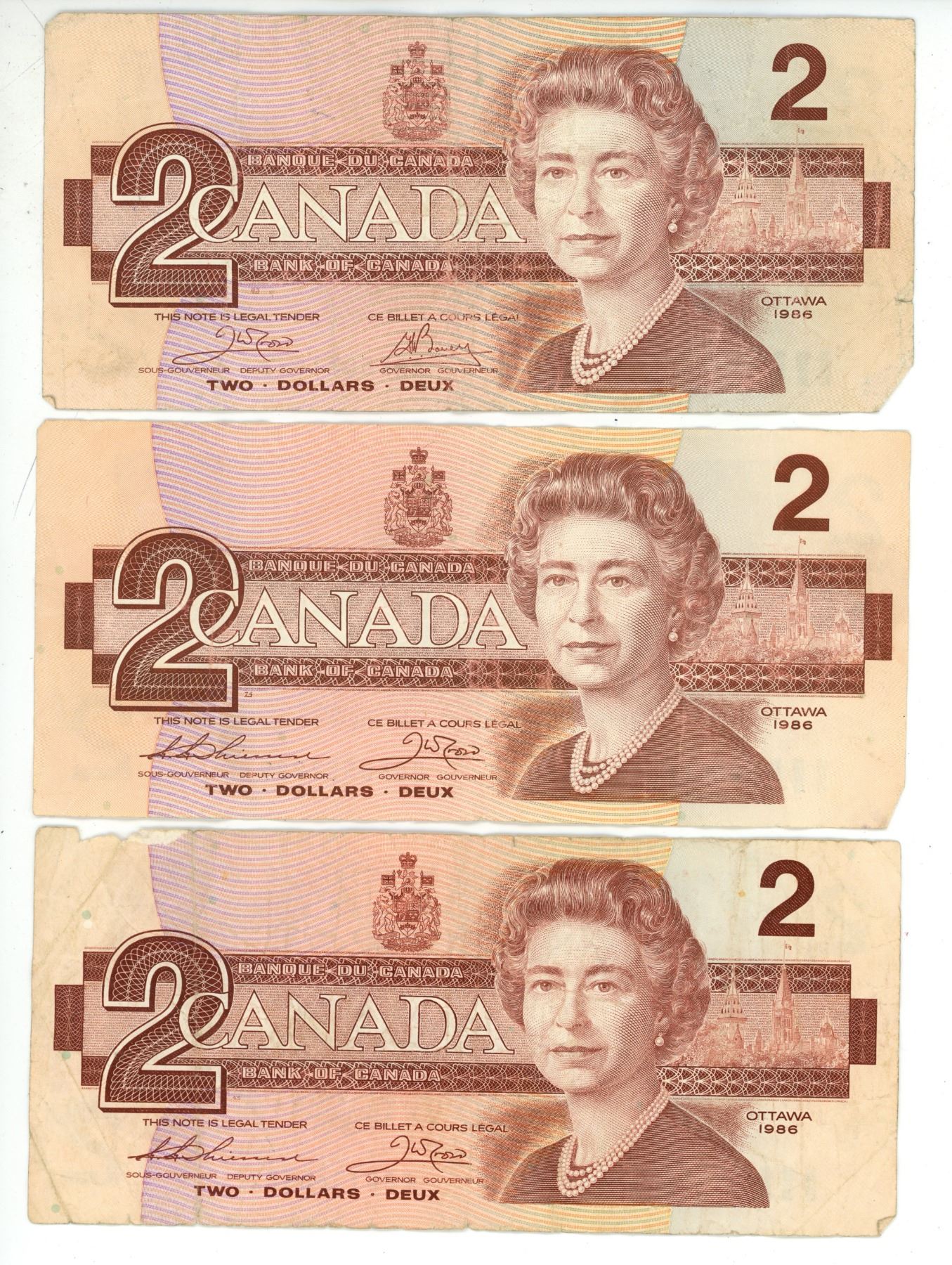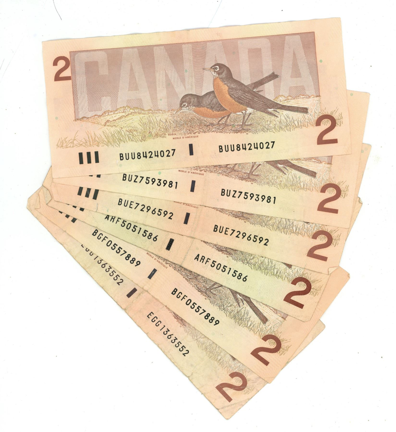 6 - 1986 Canadian 2 dollar bills - Thiessen/Crow - Assorted prefixes & serial #'s