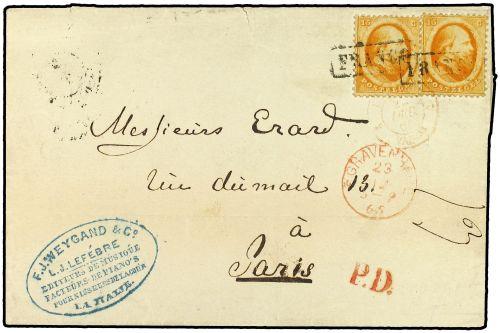 6(2) 1865 LA HAYA a PARIS. 15 cts. amarillo (2). MAGNIFICA.