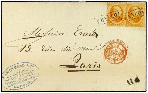 6(2) 1866 LA HAYA a FRANCIA. 15 cts. amarillo (2). MAGNIFICA.