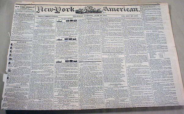 6-20-1844 NEWSPAPER - THE NEW YORK AMERICAN W/ MANY ADS
