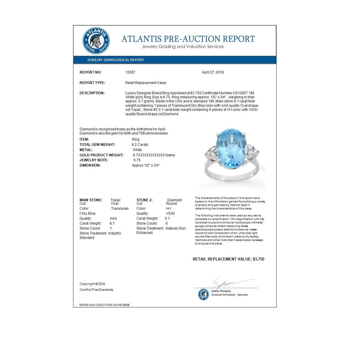 REF-52A8X -12857 ---- 6.20 CTW Blue Topaz & Diamond Ring 18K White Gold ---- Luxury Designer Brand Ring Appraised at $3,750 Certificate Number US12857 18k White gold, Ring Size is 6.75, Ring measuring approx. 1/2" x 3/4" , weighing in total approx. 5.7 grams. Made in the USA and is stamped 18k, Main stone 6.1 carat total weight containing 1 pieces of Translucent Sky Blue color with AAA quality Oval shape cut Topaz , Stone #2 0.1 carat total weight containing 6 pieces of H-I color with VS/SI quality Round shape cut Diamond
