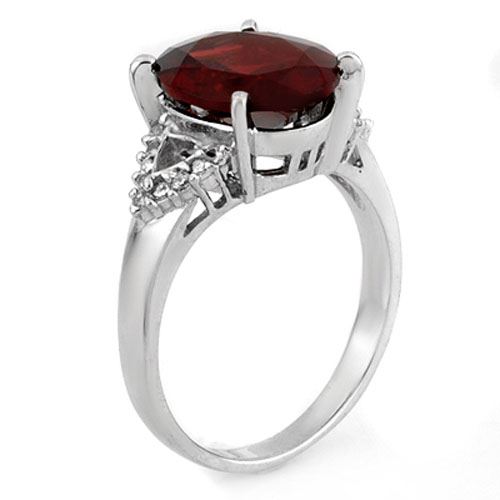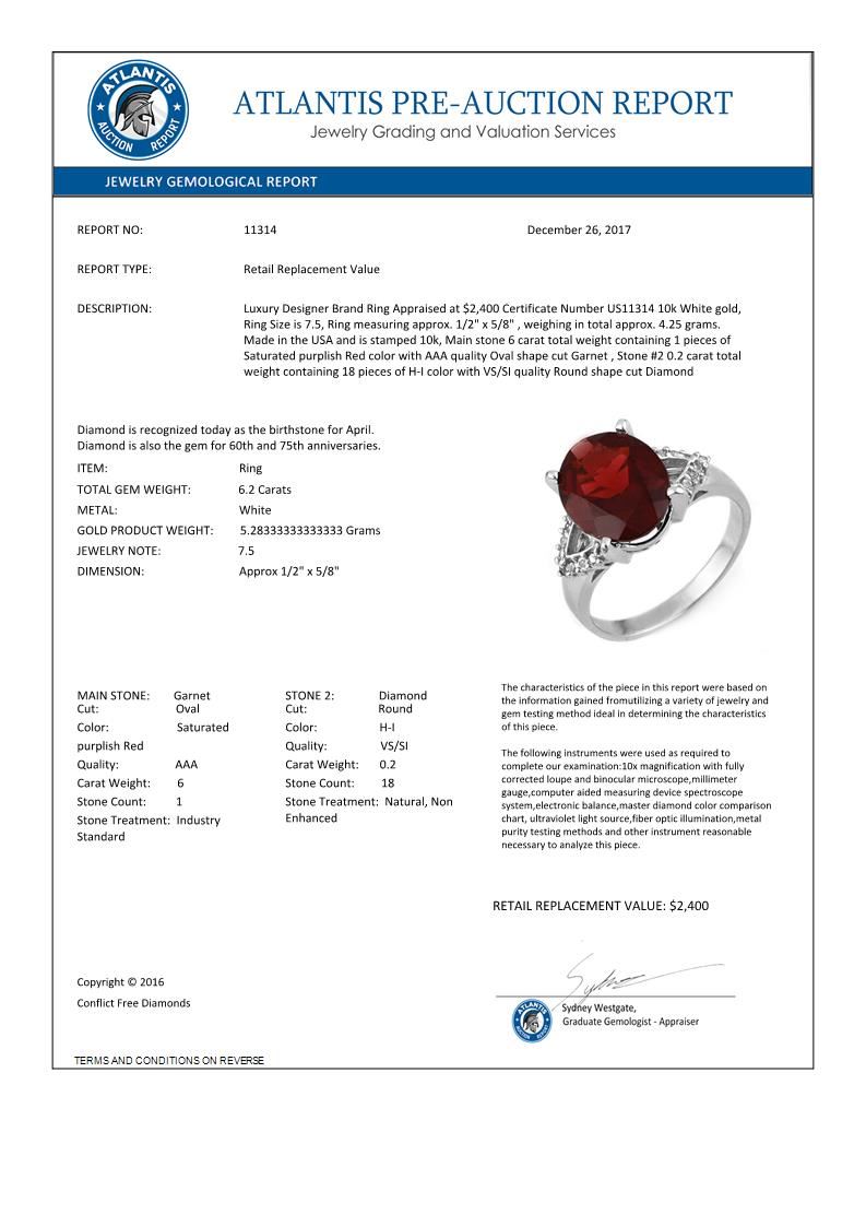 REF-40A2X -11314 ---- 6.20 CTW Garnet & Diamond Ring 10K White Gold ---- Luxury Designer Brand Ring Appraised at $2,400 Certificate Number US11314 10k White gold, Ring Size is 7.5, Ring measuring approx. 1/2" x 5/8" , weighing in total approx. 4.25 grams. Made in the USA and is stamped 10k, Main stone 6 carat total weight containing 1 pieces of Saturated purplish Red color with AAA quality Oval shape cut Garnet , Stone #2 0.2 carat total weight containing 18 pieces of H-I color with VS/SI quality Round shape cut Diamond