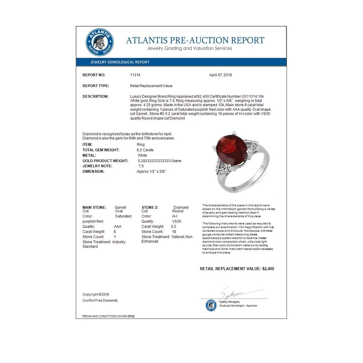 REF-40A2X -11314 ---- 6.20 CTW Garnet & Diamond Ring 10K White Gold ---- Luxury Designer Brand Ring Appraised at $2,400 Certificate Number US11314 10k White gold, Ring Size is 7.5, Ring measuring approx. 1/2" x 5/8" , weighing in total approx. 4.25 grams. Made in the USA and is stamped 10k, Main stone 6 carat total weight containing 1 pieces of Saturated purplish Red color with AAA quality Oval shape cut Garnet , Stone #2 0.2 carat total weight containing 18 pieces of H-I color with VS/SI quality Round shape cut Diamond