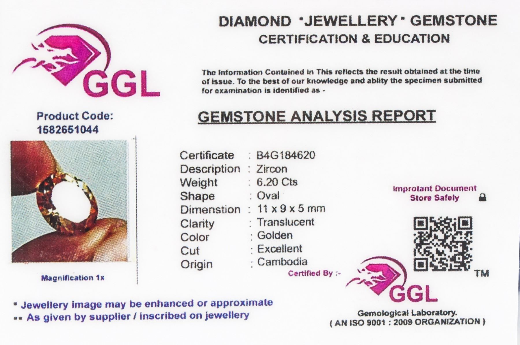 One (1) 6.20 ct oval cut golden zircon gemstone. 11 x 9 x 5 mm. Accompanied with GGL certificate.