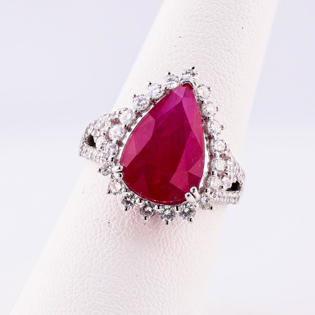 One polished, stamped, and tested platinum ring marked Aaron Gottlieb. The ring is mounted with: 1 genuine GIA certified ruby center stone weighing 6.20 carats, and 46 genuine round diamonds weighing approximately 1.09 carats. This item weighs 7.5 grams, condition is new, excellent workmanship. #MAIN GEMSTONE# GIA Report No.: 6237393447 Species: Natural Corundum Variety: Ruby Shape: Pear Cutting Style: Brilliant Cut Crown, Step Cut Pavilion Measurements: 14.84 x 9.91 x 5.16mm Weight: 6.20 carats Color: Purplish Red Transparency: Semi Transparent to Translucent Treatment: Heat with Residues Refractive Index: 1.762 - 1.770 DR Hardness: 9 #ADJACENT GEMSTONES ON RING# Identity: Natural Diamond Shape: Round Cutting Style: Brilliant Cut Quantity: 46 Diamonds Measurements: 1.3 - 2.0mm Total Weight: 1.09 carats Clarity Grade: VS2-SI1 Color Grade: F-G Refractive Index: 2.417 Hardness: 10 #RUBY WEIGHT: 6.20 ct TOTAL DIAMOND WEIGHT: 1.09 cts WEIGHT OF ITEM: 7.5 grams METAL: Platinum Size: 7 1/4
