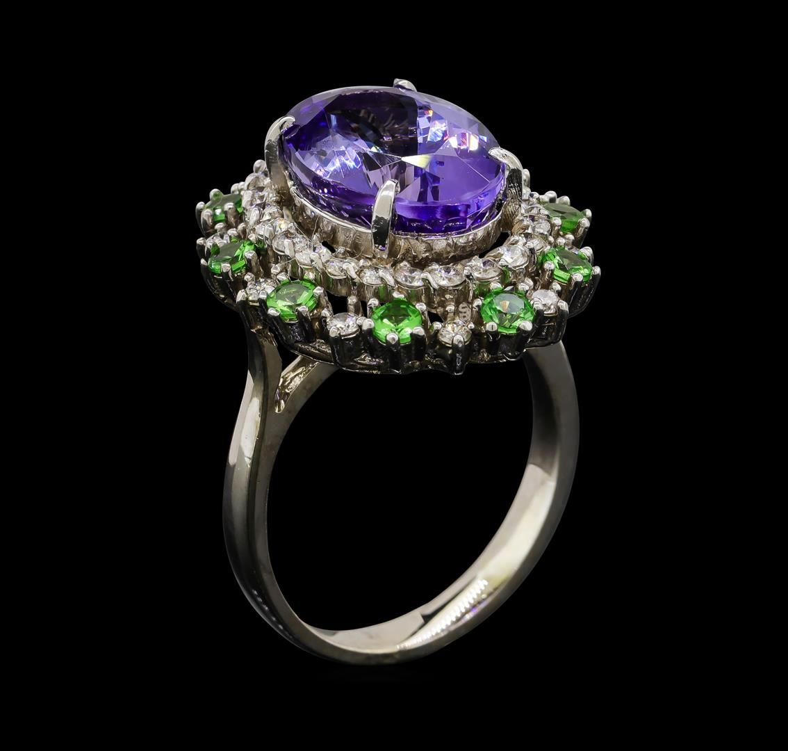 One electronically tested 14KT white gold lady's cast fashion ring with a double basket halo with a bright polish finish. The featured lady's ring has a shank measuring 2.88 millimeters wide. Identified with markings of 'K14'. Condition is new, good workmanship. Containing: One prong set oval modified brilliant cut natural tanzanite, measuring 13.35 x 9.42 x 7.04mm, (depth est.) approximate weight of 6.20ct., clarity is eye clean, medium, very slightly grayish, violet color, (GIA V 5/3), cut is good. Transmitting light with no distortion, transparent. Colored gemstones are presumed to have been subjected to commonly used enhancement processes. Graded in the setting. Ten prong set round modified brilliant cut natural tsavorite garnets, measuring 2.50 - 2.40 x 1.58 mm, (depth est.) approximate total weight of 0.72ct., clarity is eye clean, medium, moderately strong, slightly yellowish green color, (GIA slyG 5/4), cut is good. Transmitting light with no distortion, transparent. Colored gemstones are presumed to have been subjected to commonly used enhancement processes. Graded in the setting. Ten prong set round brilliant cut diamonds, measuring 1.90 - 1.85 x 1.17mm (depth est.) approximate total weight of 10 Stones = 0.26ct. Graded in the setting. Clarity SI-1 to SI-2. Color: H - I Cut Good Twenty-Four prong set round brilliant cut diamonds, measuring 1.60 - 1.55 x 0.98mm (depth est.) approximate total weight of 24 Stones = 0.36ct. Graded in the setting. Clarity SI-1 to SI-2. Color: H - I Cut Good. Total Weight of Colored Stones 6.92ct.. Total Weight of Diamonds 0.62ct.. Total Weight of Ring 7.40gm. GAS Appraised at $10,655.00.