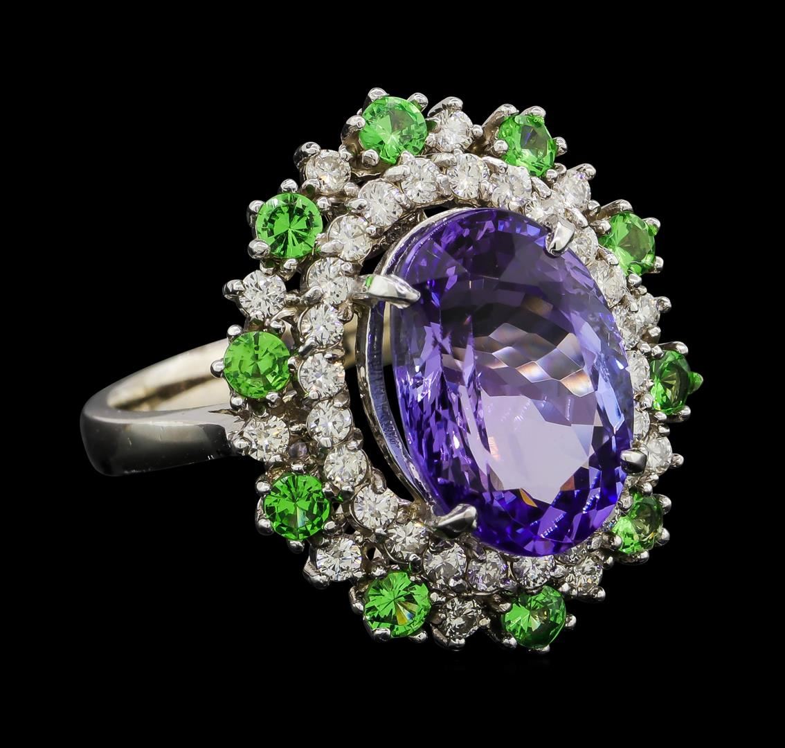 One electronically tested 14KT white gold lady's cast fashion ring with a double basket halo with a bright polish finish. The featured lady's ring has a shank measuring 2.88 millimeters wide. Identified with markings of 'K14'. Condition is new, good workmanship. Containing: One prong set oval modified brilliant cut natural tanzanite, measuring 13.35 x 9.42 x 7.04mm, (depth est.) approximate weight of 6.20ct., clarity is eye clean, medium, very slightly grayish, violet color, (GIA V 5/3), cut is good. Transmitting light with no distortion, transparent. Colored gemstones are presumed to have been subjected to commonly used enhancement processes. Graded in the setting. Ten prong set round modified brilliant cut natural tsavorite garnets, measuring 2.50 - 2.40 x 1.58 mm, (depth est.) approximate total weight of 0.72ct., clarity is eye clean, medium, moderately strong, slightly yellowish green color, (GIA slyG 5/4), cut is good. Transmitting light with no distortion, transparent. Colored gemstones are presumed to have been subjected to commonly used enhancement processes. Graded in the setting. Ten prong set round brilliant cut diamonds, measuring 1.90 - 1.85 x 1.17mm (depth est.) approximate total weight of 10 Stones = 0.26ct. Graded in the setting. Clarity SI-1 to SI-2. Color: H - I Cut Good Twenty-Four prong set round brilliant cut diamonds, measuring 1.60 - 1.55 x 0.98mm (depth est.) approximate total weight of 24 Stones = 0.36ct. Graded in the setting. Clarity SI-1 to SI-2. Color: H - I Cut Good. Total Weight of Colored Stones 6.92ct.. Total Weight of Diamonds 0.62ct.. Total Weight of Ring 7.40gm. GAS Appraised at $10,655.00.
