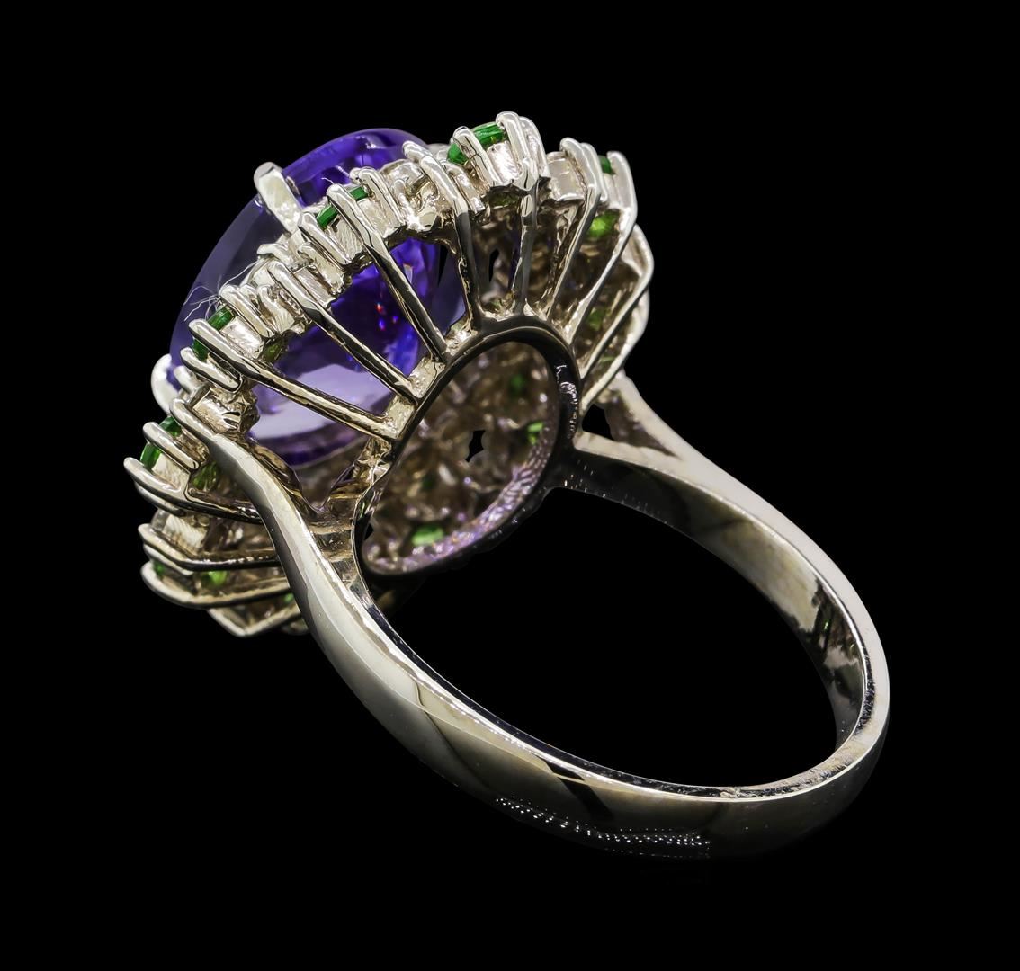 One electronically tested 14KT white gold lady's cast fashion ring with a double basket halo with a bright polish finish. The featured lady's ring has a shank measuring 2.88 millimeters wide. Identified with markings of 'K14'. Condition is new, good workmanship. Containing: One prong set oval modified brilliant cut natural tanzanite, measuring 13.35 x 9.42 x 7.04mm, (depth est.) approximate weight of 6.20ct., clarity is eye clean, medium, very slightly grayish, violet color, (GIA V 5/3), cut is good. Transmitting light with no distortion, transparent. Colored gemstones are presumed to have been subjected to commonly used enhancement processes. Graded in the setting. Ten prong set round modified brilliant cut natural tsavorite garnets, measuring 2.50 - 2.40 x 1.58 mm, (depth est.) approximate total weight of 0.72ct., clarity is eye clean, medium, moderately strong, slightly yellowish green color, (GIA slyG 5/4), cut is good. Transmitting light with no distortion, transparent. Colored gemstones are presumed to have been subjected to commonly used enhancement processes. Graded in the setting. Ten prong set round brilliant cut diamonds, measuring 1.90 - 1.85 x 1.17mm (depth est.) approximate total weight of 10 Stones = 0.26ct. Graded in the setting. Clarity SI-1 to SI-2. Color: H - I Cut Good Twenty-Four prong set round brilliant cut diamonds, measuring 1.60 - 1.55 x 0.98mm (depth est.) approximate total weight of 24 Stones = 0.36ct. Graded in the setting. Clarity SI-1 to SI-2. Color: H - I Cut Good. Total Weight of Colored Stones 6.92ct.. Total Weight of Diamonds 0.62ct.. Total Weight of Ring 7.40gm. GAS Appraised at $10,655.00.