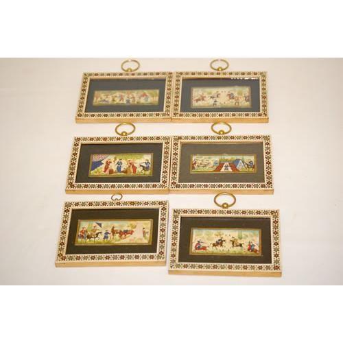 (6) 20TH CENT. ASIAN PAINTINGS ON IVORY DEPICTING ARISTOCRATIC PASTIMES OF MOGUL INDIA-6 DIFFERENT SUBJECTS IN IVORY MOSAIC FRAMES W/ 6 POINTED STARS (1 3/4" X 3 1/2", FRAMES-4 3/8" X 5 7/8") - WEAR, SMALL FRAME LOSSES, IMPERFECTIONS