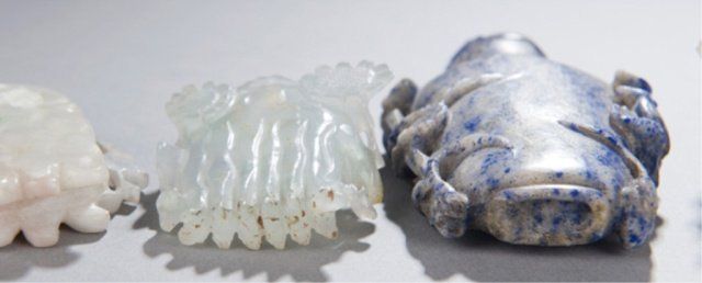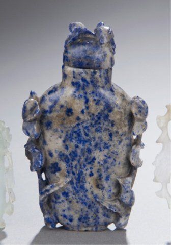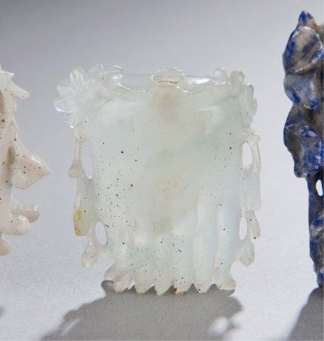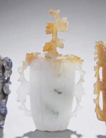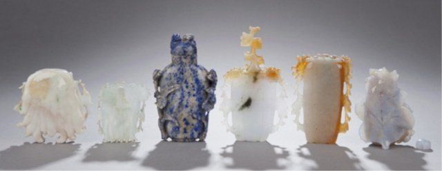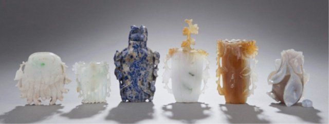 A group of six hardstone snuff bottles. 20th century. Including jadeite and agate.
