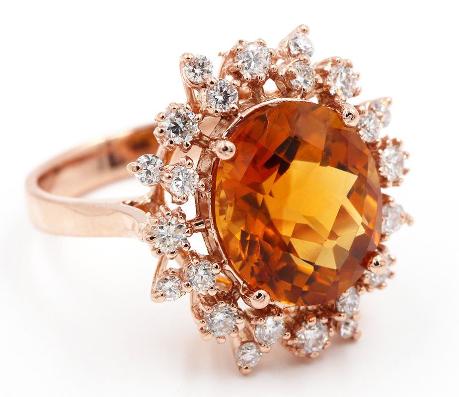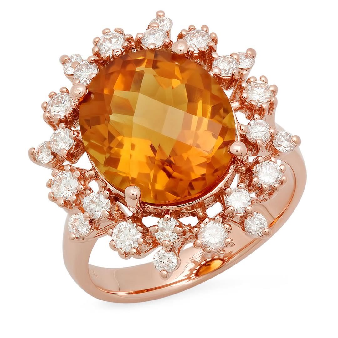 One Oval Cut Maderia Citrine Diamond Engagement Ring in 14k Rose Gold. Size 6.75 but resizable. Total carat weight is 6.21 Ct. Setting style is 4 prong with gorgeous design. Gross weight of the ring is 6.50 grams, with a total of 25 stones. Condition is brand new. Main stone is natural and non-enhanced. Main stone is 5.42 carats, oval checker shape, clarity is good, fine deep orange color, and has an excellent cut. Side stones are natural and non-enhanced, 0.79 carats, diamond shape is brilliant round cut with SI1 clarity and G-H color. Side diamond cut is excellent with 24 stones. Included with independent certification with a retail value of $10,000.