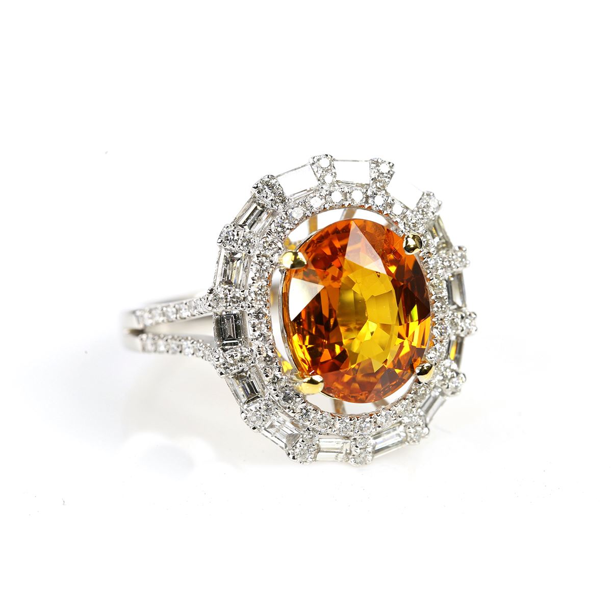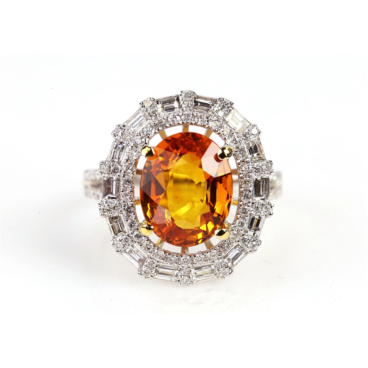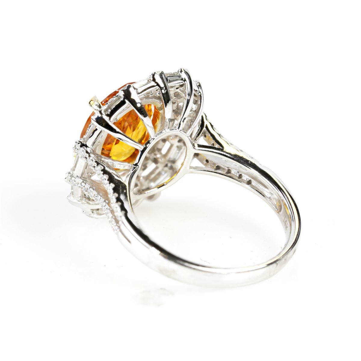 14K GOLD ORANGE SAPPHIRE AND DIAMOND RING /Diamond Count 1:/Diamond Total Carat :1.32/Diamond Color & Clarity:G-H/SI1-SI3/Diamond Count 2:/Diamond 2 CTW:/Diamond Count 3:/Gemstone Count 1:/Gemstone CTW:4.91/Gemstone Dimension:11.60 x 9.40 MM/Gemstone Shape:Oval-Orange Sapphire /Gemstone Count 2:/Gemstone Shape:/Ring Dimension:/Metal Type 1:14kWhite Gold :Gram Weight:5/Metal Type 2:/ Weight Gram:/Gross Weight :/Ring Size:7