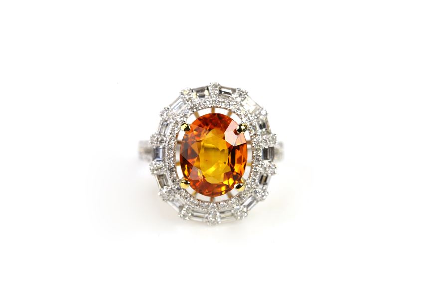 14K GOLD ORANGE SAPPHIRE AND DIAMOND RING /Diamond Count 1:/Diamond Total Carat :1.32/Diamond Color & Clarity:G-H/SI1-SI3/Diamond Count 2:/Diamond 2 CTW:/Diamond Count 3:/Gemstone Count 1:/Gemstone CTW:4.91/Gemstone Dimension:11.60 x 9.40 MM/Gemstone Shape:Oval-Orange Sapphire /Gemstone Count 2:/Gemstone Shape:/Ring Dimension:/Metal Type 1:14kWhite Gold :Gram Weight:5/Metal Type 2:/ Weight Gram:/Gross Weight :/Ring Size:7