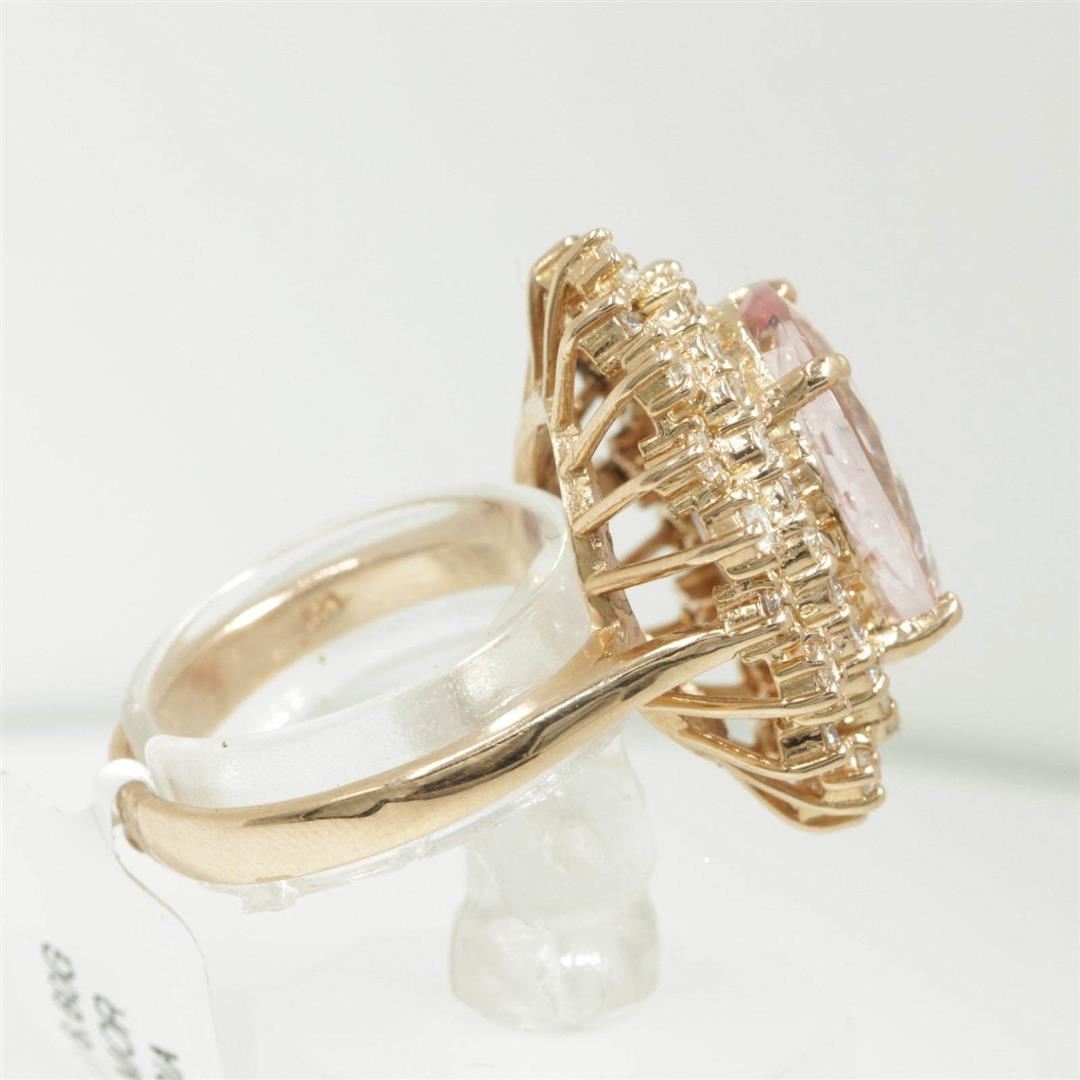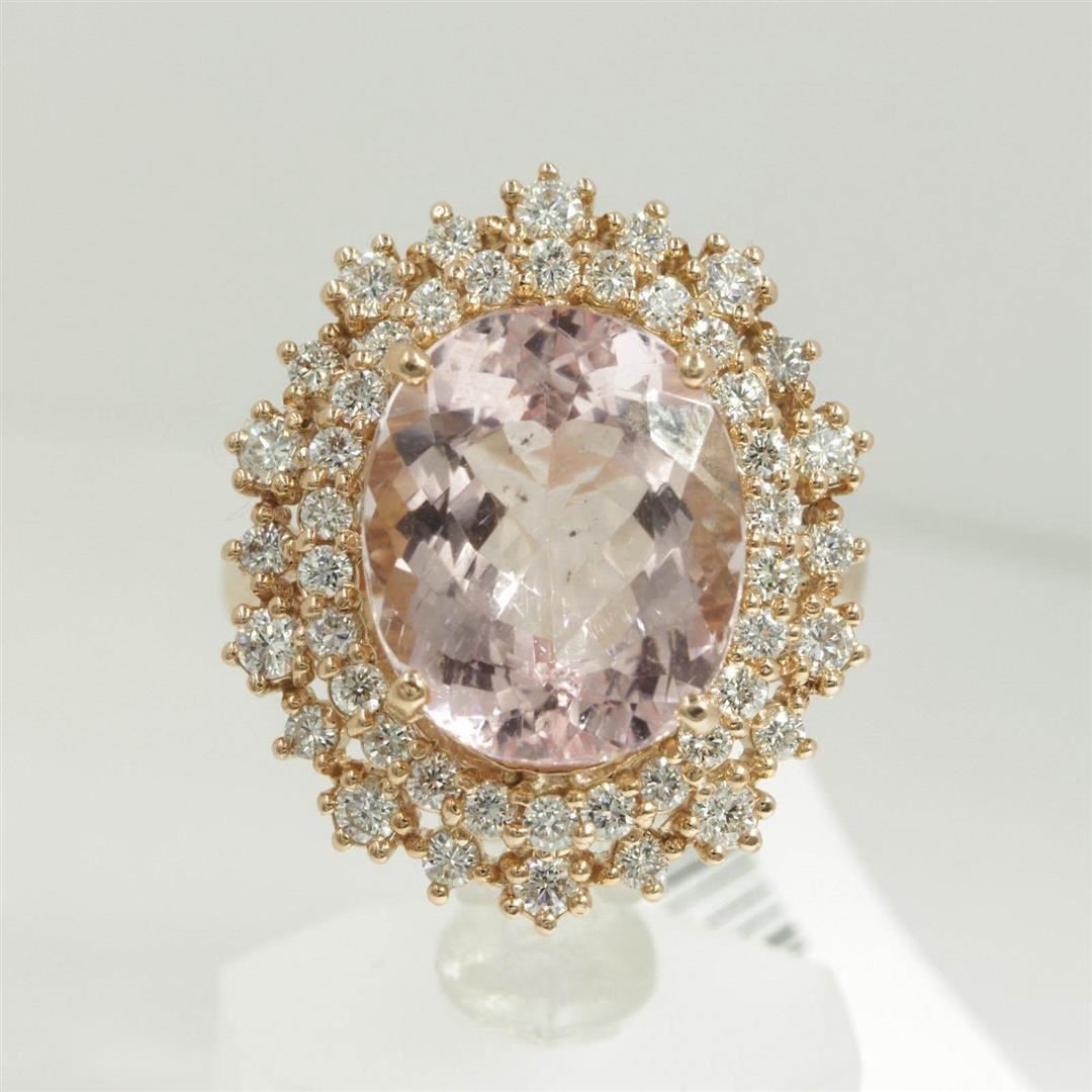 One engagement ring featuring: 14KT rose gold weighing 6.60 grams containing one morganite weighing 6.23ct and 46 diamonds weighing 0.95ctw. The morganite is oval cut with good clarity, fine pink color and excellent cut. The diamonds are round brilliant c