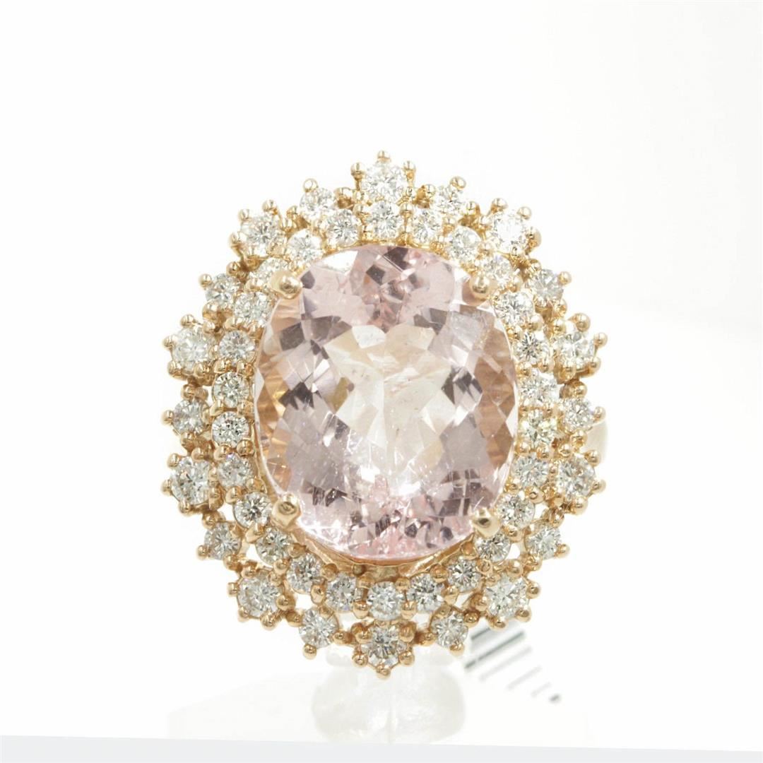 One engagement ring featuring: 14KT rose gold weighing 6.60 grams containing one morganite weighing 6.23ct and 46 diamonds weighing 0.95ctw. The morganite is oval cut with good clarity, fine pink color and excellent cut. The diamonds are round brilliant cut and are natural, unenhanced stones with SI-1 clarity, G-H color and excellent cut. The ring is a size 6.5 but is resizable.