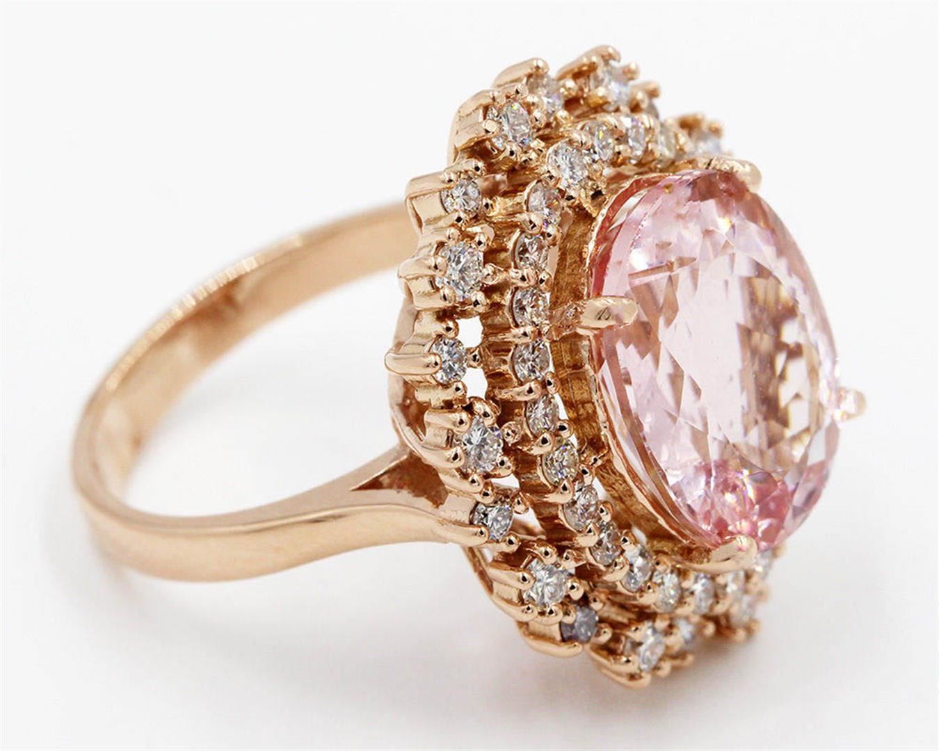 One engagement ring featuring: 14KT rose gold weighing 6.60 grams containing one morganite weighing 6.23ct and 46 diamonds weighing 0.95ctw. The morganite is oval cut with good clarity, fine pink color and excellent cut. The diamonds are round brilliant cut and are natural, unenhanced stones with SI-1 clarity, G-H color and excellent cut. The ring is a size 6.5 but is resizable.