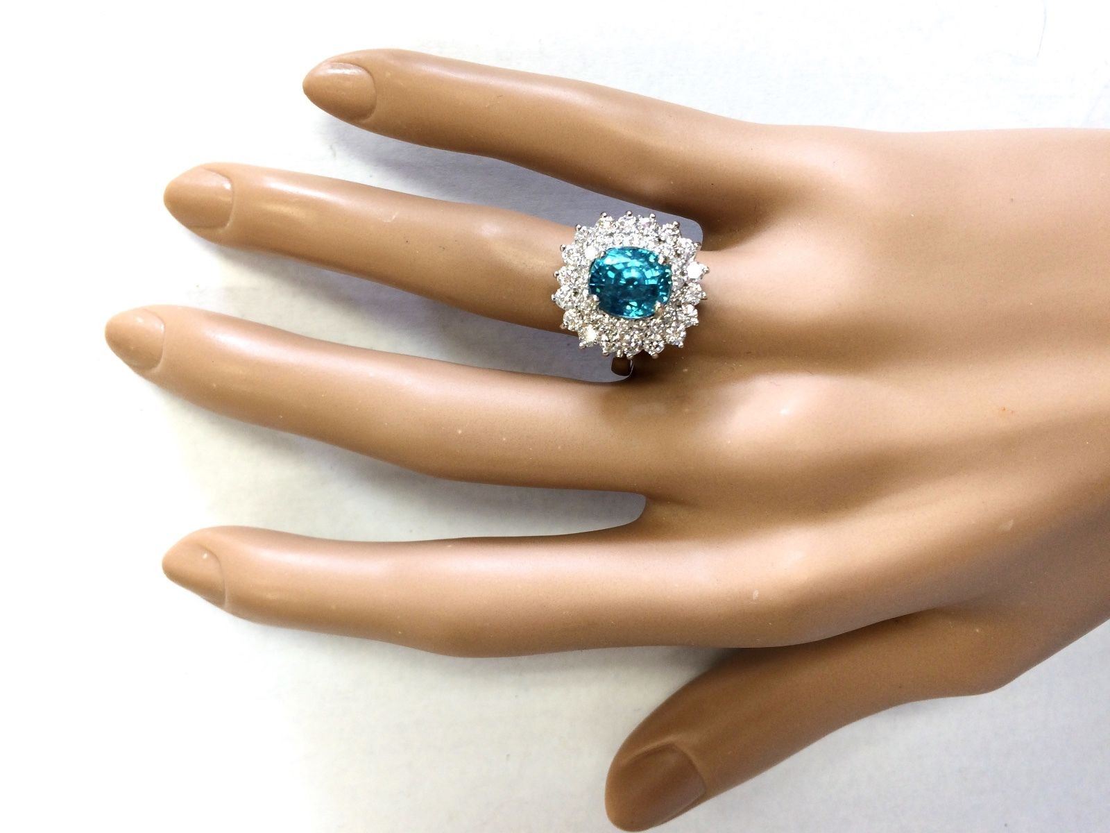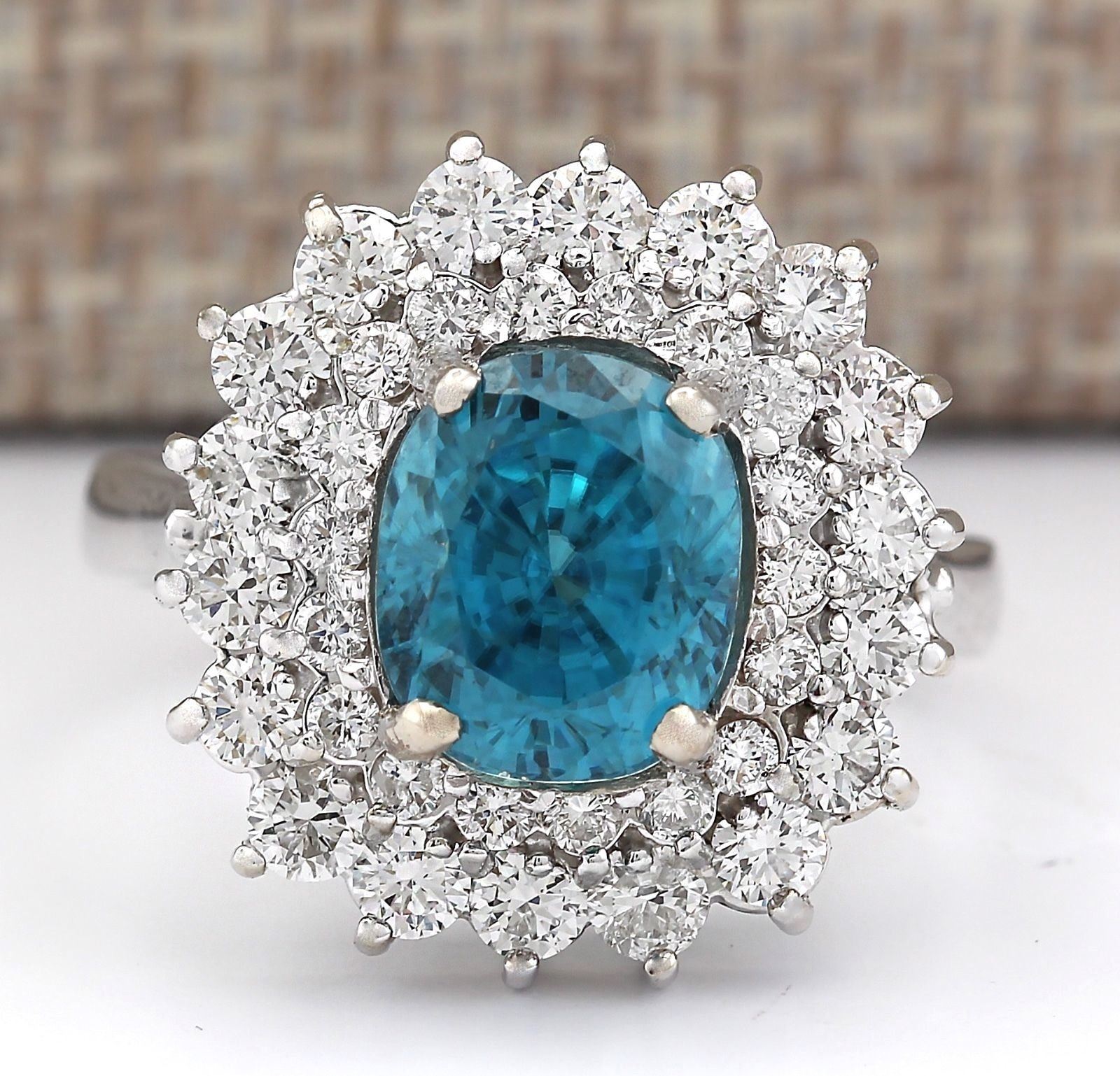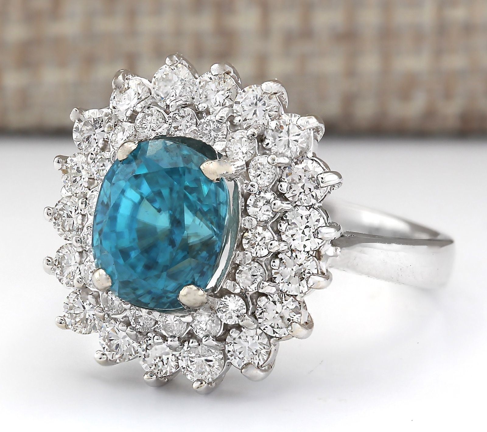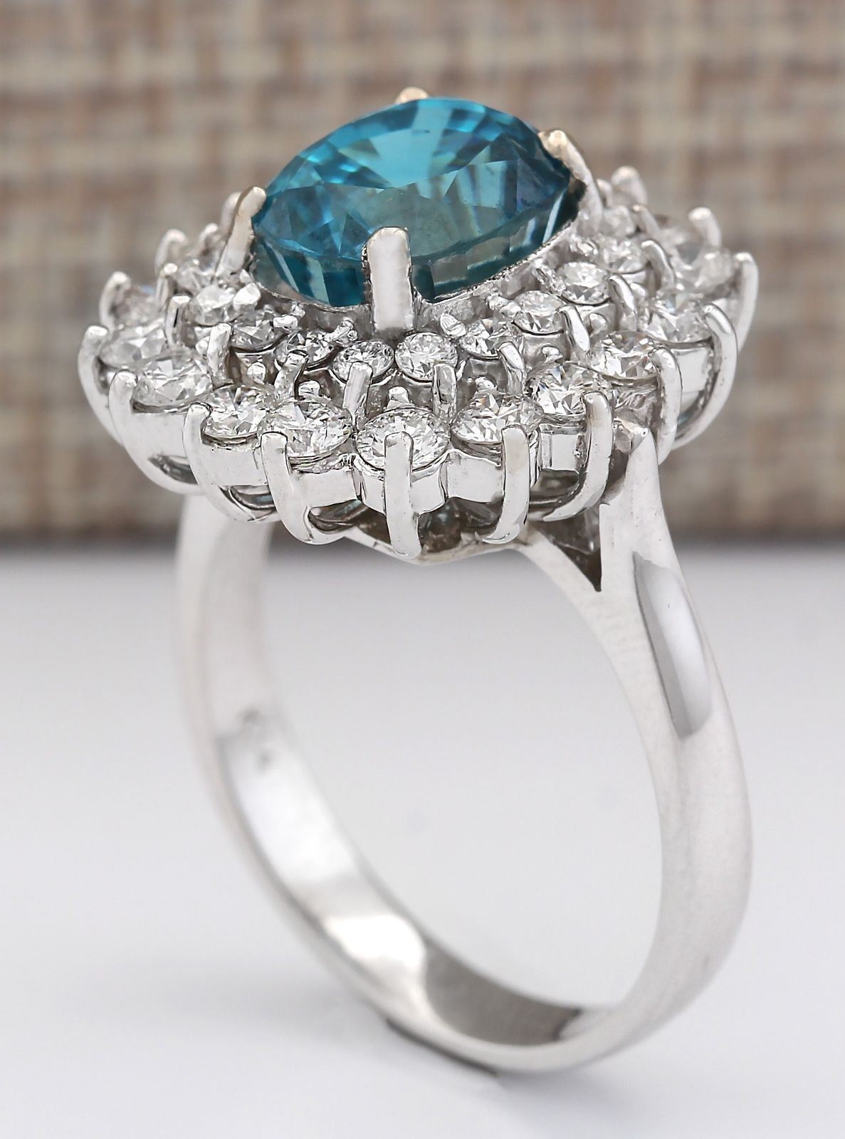 6.24 CTW Natural Blue Zircon And Diamond Ring 18K Solid White Gold