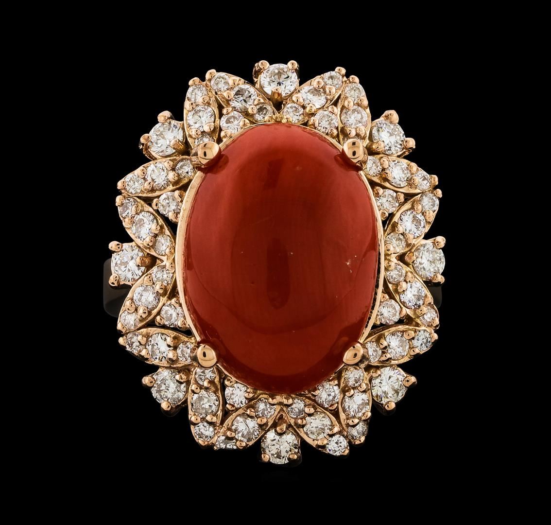 One electronically tested 14KT rose gold lady's cast fashion ring with a staggered basket halo with a bright polish finish. The featured lady's ring has a shank measuring 3.39 millimeters wide. Identified with markings of 'K14'. Condition is new, good workmanship. Containing: One prong set oval cabochon standard cut natural red coral, measuring 15.33 x 11.25 x 4.95mm, (depth est.) approximate weight of 6.24ct., clarity is slightly included, medium, very slightly brownish, orangy red color, (GIA oR 5/3), cut is very good. Colored gemstones are presumed to have been subjected to commonly used enhancement processes. Graded in the setting. Eight prong set round brilliant cut diamonds, measuring 2.20 - 2.15 x 1.35mm (depth est.) approximate total weight of 8 Stones = 0.31ct. Graded in the setting. Clarity SI-1 to I-1. Color: H - I Cut Good Sixteen prong set round brilliant cut diamonds, measuring 1.70 - 1.65 x 1.02mm (depth est.) approximate total weight of 16 Stones = 0.28ct. Graded in the setting. Clarity SI-1 to I-1. Color: G - H Cut Good Forty prong set round brilliant cut diamonds, measuring 1.50 - 1.20 x 0.81mm (depth est.) approximate total weight of 40 Stones = 0.33ct. Graded in the setting. Clarity SI-1 to I-1. Color: G - I Cut Good. Total Weight of Colored Stones 6.24ct.. Total Weight of Diamonds 0.92ct.. Total Weight of Ring 8.70gm. GAS Appraised at $6,345.00.