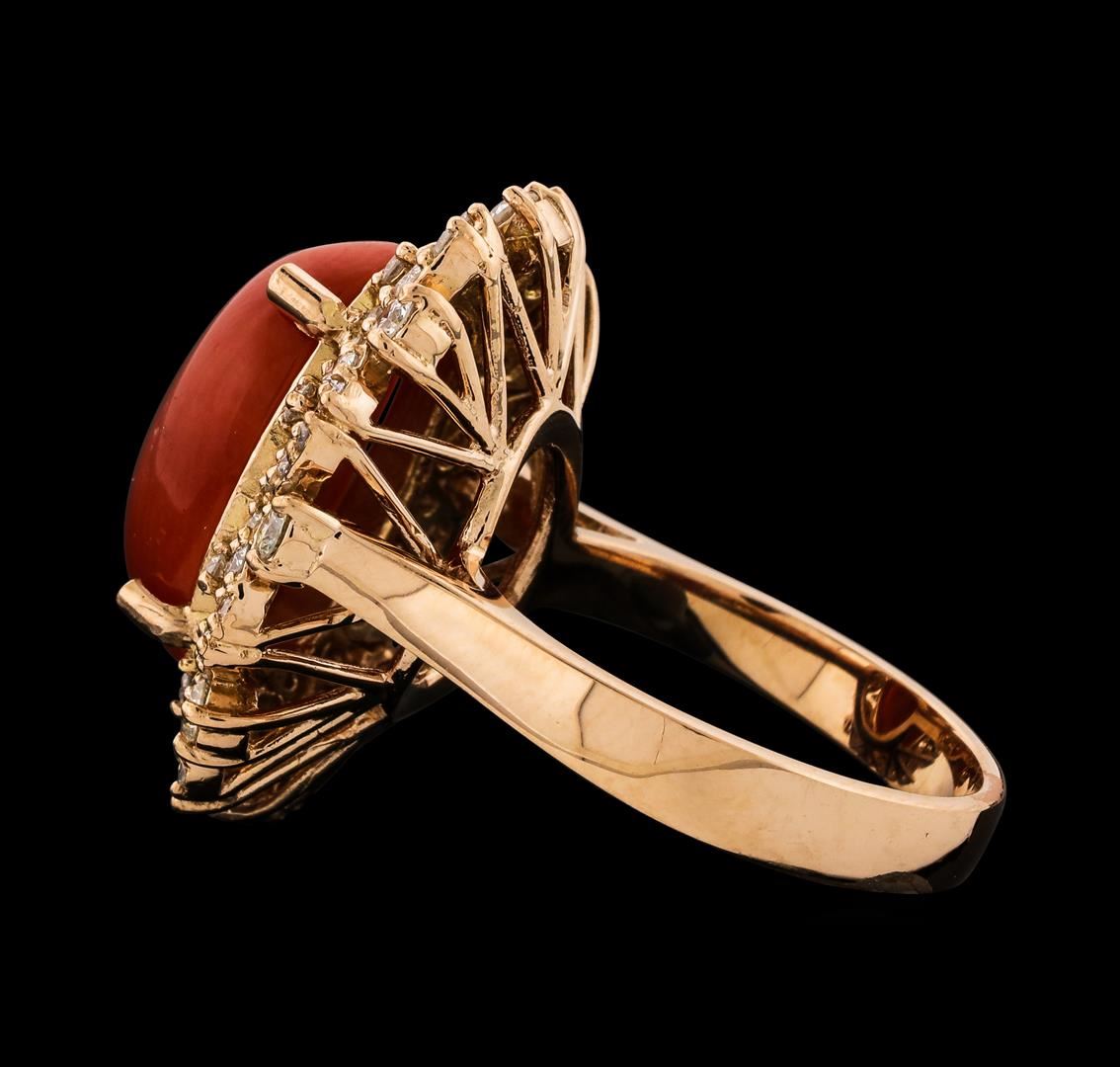 One electronically tested 14KT rose gold lady's cast fashion ring with a staggered basket halo with a bright polish finish. The featured lady's ring has a shank measuring 3.39 millimeters wide. Identified with markings of 'K14'. Condition is new, good workmanship. Containing: One prong set oval cabochon standard cut natural red coral, measuring 15.33 x 11.25 x 4.95mm, (depth est.) approximate weight of 6.24ct., clarity is slightly included, medium, very slightly brownish, orangy red color, (GIA oR 5/3), cut is very good. Colored gemstones are presumed to have been subjected to commonly used enhancement processes. Graded in the setting. Eight prong set round brilliant cut diamonds, measuring 2.20 - 2.15 x 1.35mm (depth est.) approximate total weight of 8 Stones = 0.31ct. Graded in the setting. Clarity SI-1 to I-1. Color: H - I Cut Good Sixteen prong set round brilliant cut diamonds, measuring 1.70 - 1.65 x 1.02mm (depth est.) approximate total weight of 16 Stones = 0.28ct. Graded in the setting. Clarity SI-1 to I-1. Color: G - H Cut Good Forty prong set round brilliant cut diamonds, measuring 1.50 - 1.20 x 0.81mm (depth est.) approximate total weight of 40 Stones = 0.33ct. Graded in the setting. Clarity SI-1 to I-1. Color: G - I Cut Good. Total Weight of Colored Stones 6.24ct.. Total Weight of Diamonds 0.92ct.. Total Weight of Ring 8.70gm. GAS Appraised at $6,345.00.