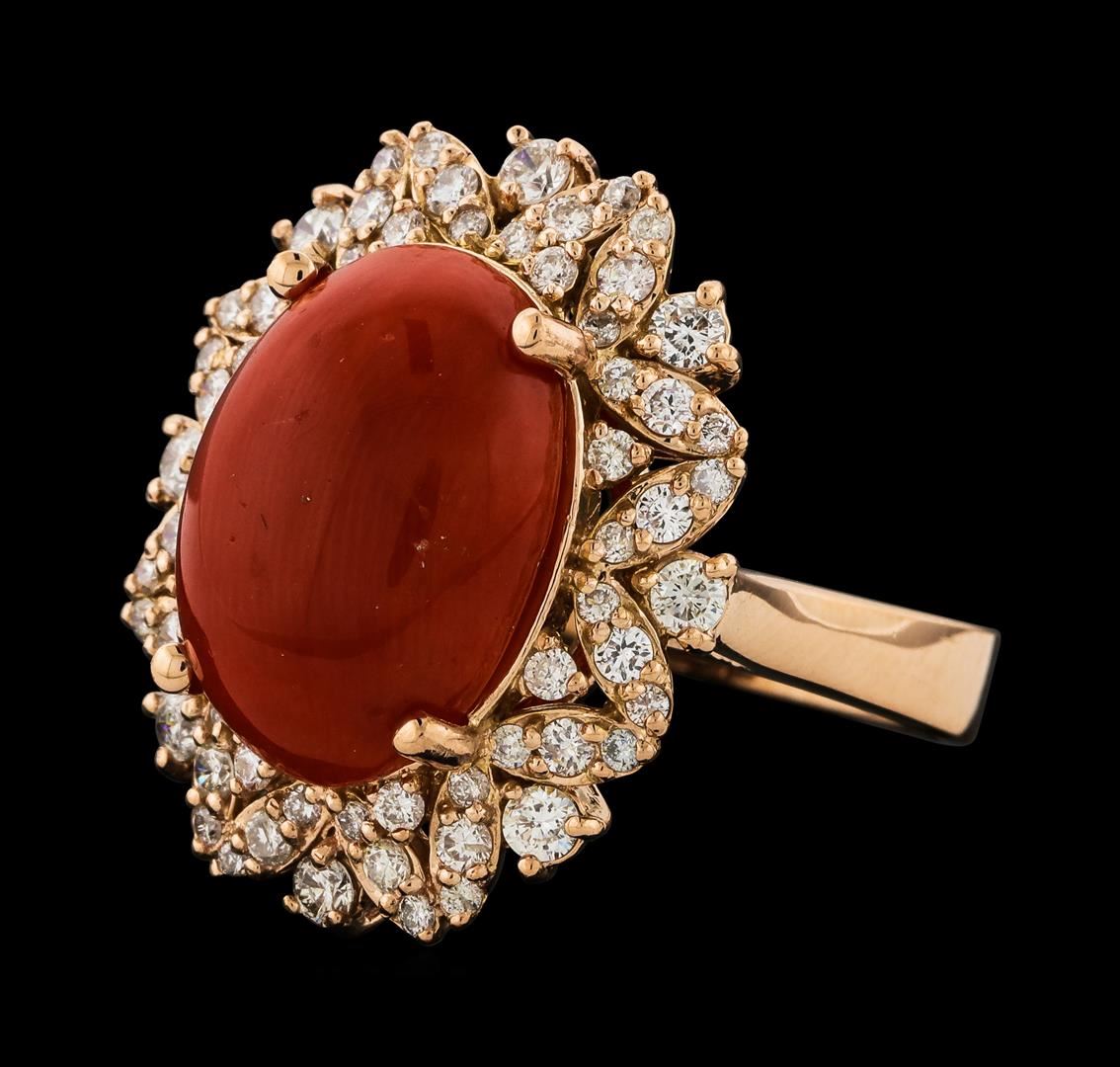 One electronically tested 14KT rose gold lady's cast fashion ring with a staggered basket halo with a bright polish finish. The featured lady's ring has a shank measuring 3.39 millimeters wide. Identified with markings of 'K14'. Condition is new, good workmanship. Containing: One prong set oval cabochon standard cut natural red coral, measuring 15.33 x 11.25 x 4.95mm, (depth est.) approximate weight of 6.24ct., clarity is slightly included, medium, very slightly brownish, orangy red color, (GIA oR 5/3), cut is very good. Colored gemstones are presumed to have been subjected to commonly used enhancement processes. Graded in the setting. Eight prong set round brilliant cut diamonds, measuring 2.20 - 2.15 x 1.35mm (depth est.) approximate total weight of 8 Stones = 0.31ct. Graded in the setting. Clarity SI-1 to I-1. Color: H - I Cut Good Sixteen prong set round brilliant cut diamonds, measuring 1.70 - 1.65 x 1.02mm (depth est.) approximate total weight of 16 Stones = 0.28ct. Graded in the setting. Clarity SI-1 to I-1. Color: G - H Cut Good Forty prong set round brilliant cut diamonds, measuring 1.50 - 1.20 x 0.81mm (depth est.) approximate total weight of 40 Stones = 0.33ct. Graded in the setting. Clarity SI-1 to I-1. Color: G - I Cut Good. Total Weight of Colored Stones 6.24ct.. Total Weight of Diamonds 0.92ct.. Total Weight of Ring 8.70gm. GAS Appraised at $6,345.00.