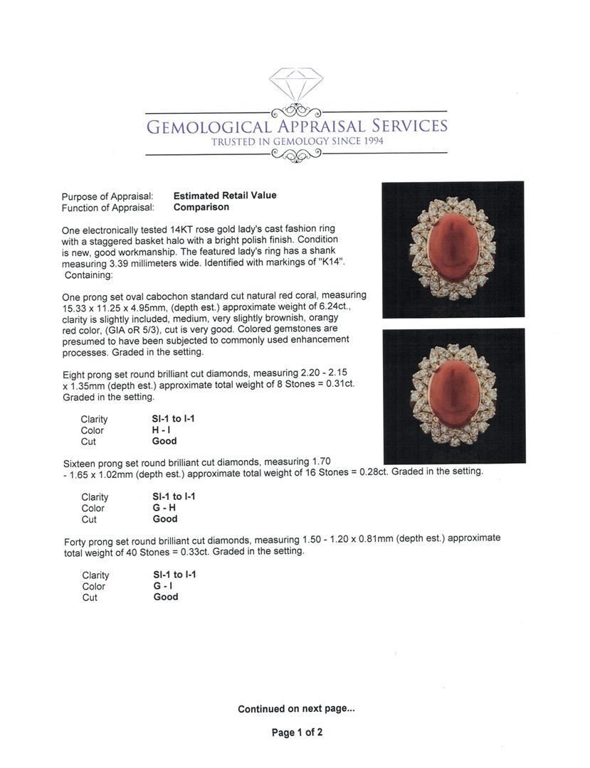 One electronically tested 14KT rose gold lady's cast fashion ring with a staggered basket halo with a bright polish finish. The featured lady's ring has a shank measuring 3.39 millimeters wide. Identified with markings of 'K14'. Condition is new, good workmanship. Containing: One prong set oval cabochon standard cut natural red coral, measuring 15.33 x 11.25 x 4.95mm, (depth est.) approximate weight of 6.24ct., clarity is slightly included, medium, very slightly brownish, orangy red color, (GIA oR 5/3), cut is very good. Colored gemstones are presumed to have been subjected to commonly used enhancement processes. Graded in the setting. Eight prong set round brilliant cut diamonds, measuring 2.20 - 2.15 x 1.35mm (depth est.) approximate total weight of 8 Stones = 0.31ct. Graded in the setting. Clarity SI-1 to I-1. Color: H - I Cut Good Sixteen prong set round brilliant cut diamonds, measuring 1.70 - 1.65 x 1.02mm (depth est.) approximate total weight of 16 Stones = 0.28ct. Graded in the setting. Clarity SI-1 to I-1. Color: G - H Cut Good Forty prong set round brilliant cut diamonds, measuring 1.50 - 1.20 x 0.81mm (depth est.) approximate total weight of 40 Stones = 0.33ct. Graded in the setting. Clarity SI-1 to I-1. Color: G - I Cut Good. Total Weight of Colored Stones 6.24ct.. Total Weight of Diamonds 0.92ct.. Total Weight of Ring 8.70gm. GAS Appraised.