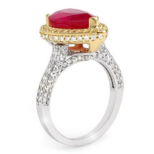 6.25 CTW Ruby & Diamond Ring 14K 2-Tone Gold ---- Luxury Designer Brand Ring Appraised Retail Price at $8,850 ---- SKU Number US10692 14k 2-Tone gold Ring Size is 7, Ring measuring approx. 11/16" x 3/4" , weighing in total approx. 7.1 grams. Made in the USA and is stamped 14k, Main stone 5 carat total weight containing 1 pieces of Mid-Opaque-Deep Red color with AAA quality Pear shape cut Ruby , Stone #2 1.25 carat total weight containing 131 pieces of H-I color with VS/SI quality Round shape cut